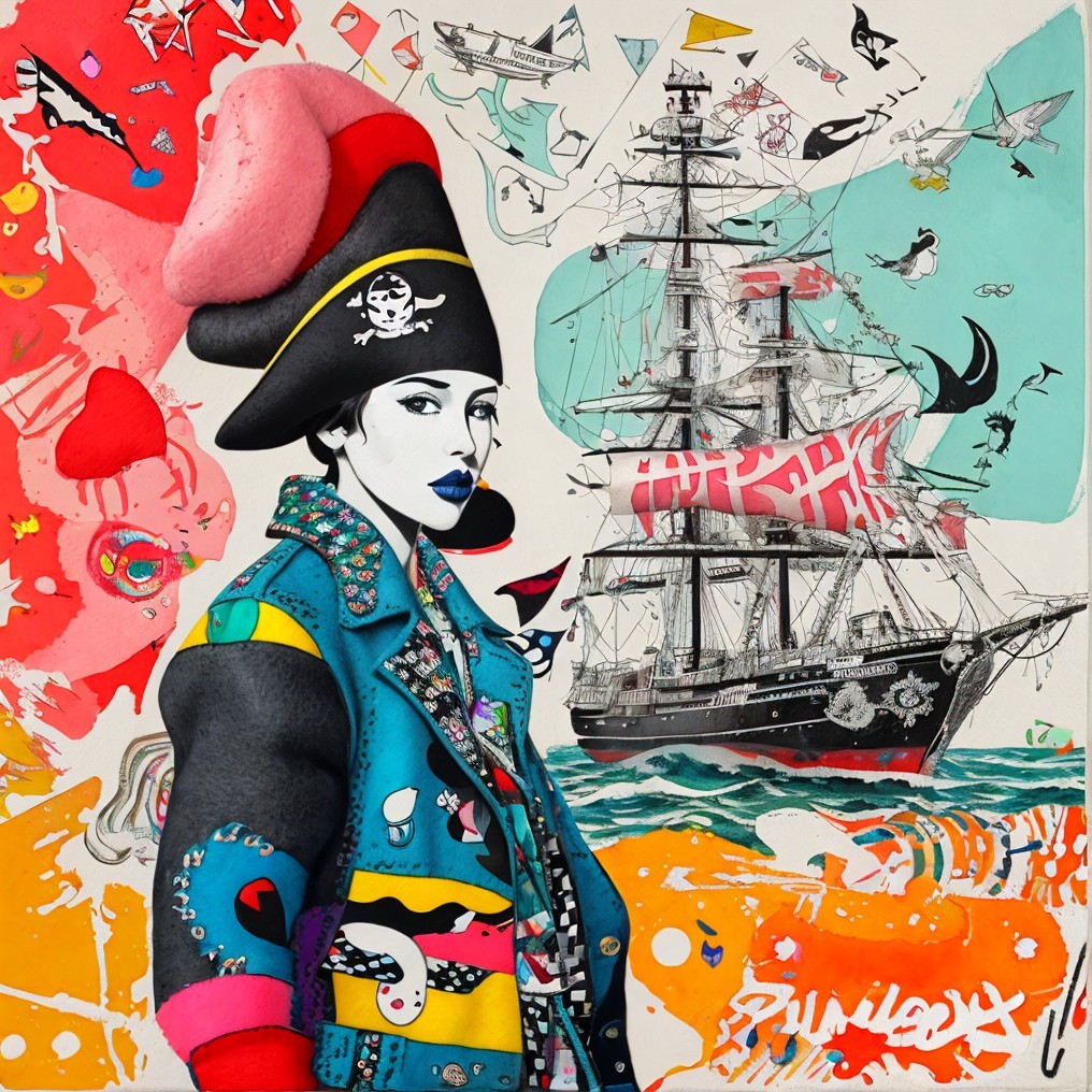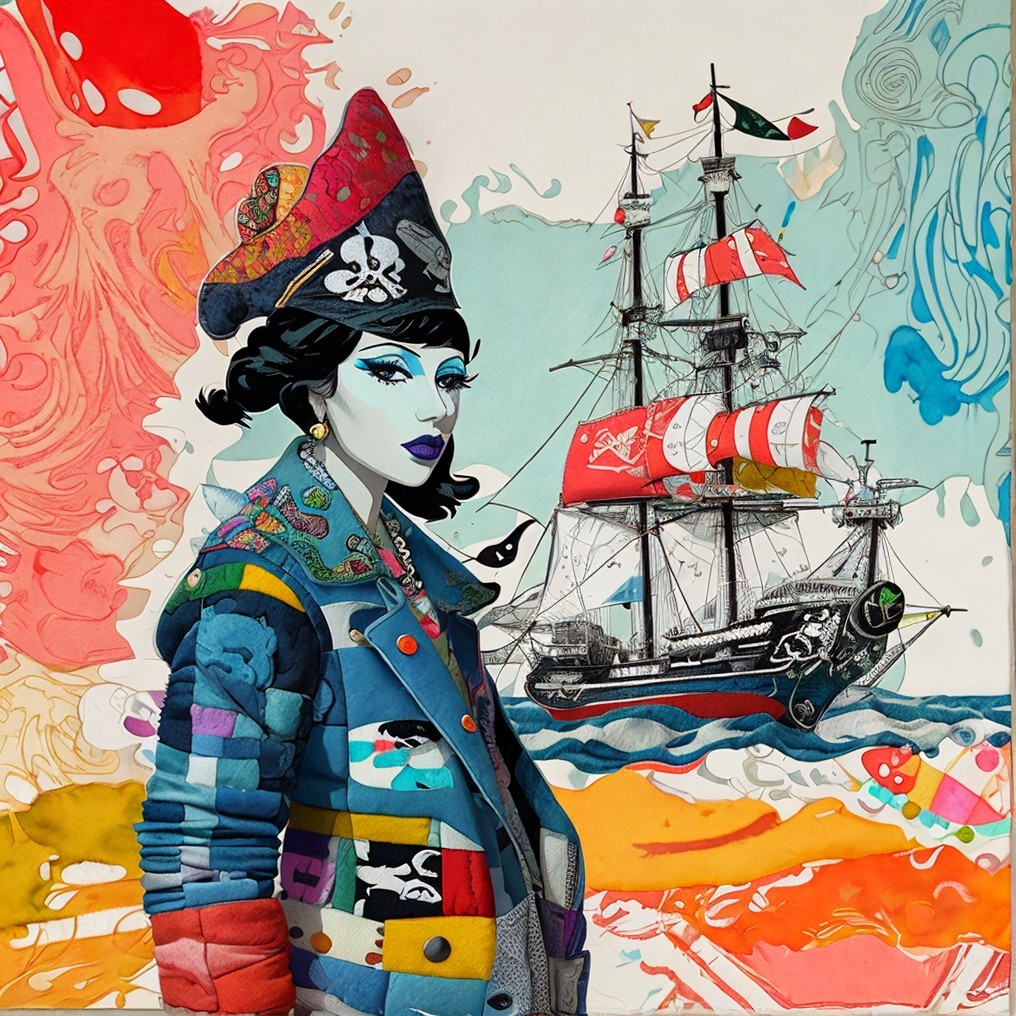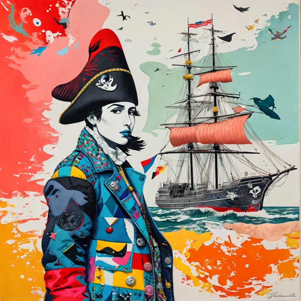 Tags: #aiart #contemporaryart #dynamicwaves #feltcollage #patchworkcoat #pirate #popart #portrait #sailingship #surrealism #tmpamib #vibrantbackdrop #deepdreamgenerator