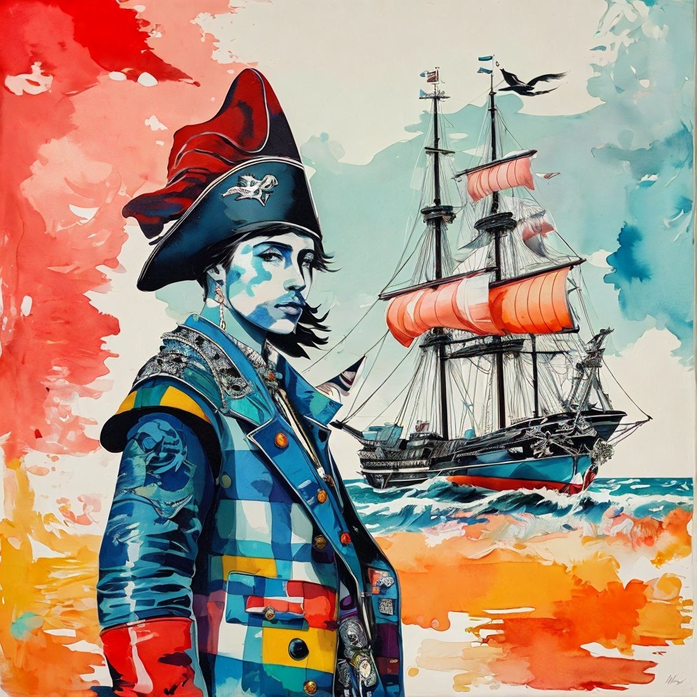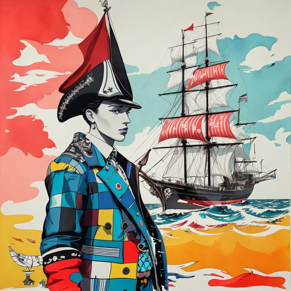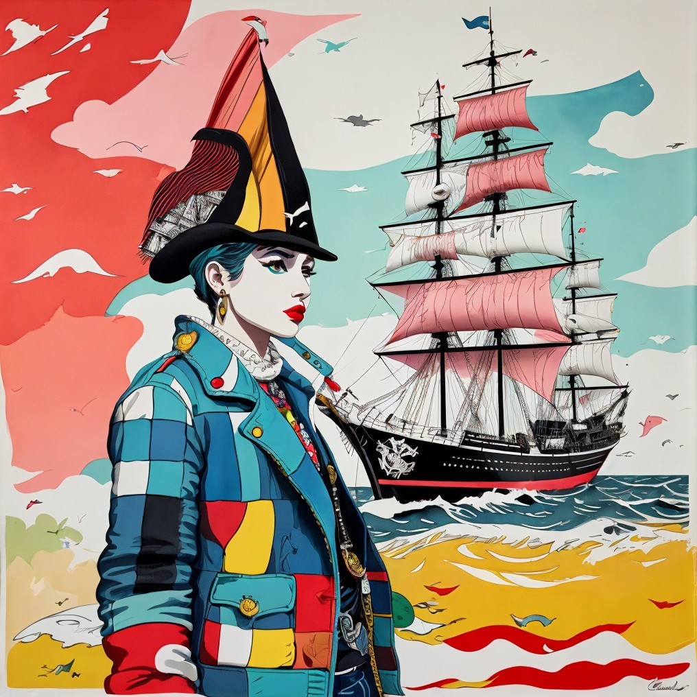 Tags: #aiart #contemporaryart #dynamicwaves #feltcollage #patchworkcoat #pirate #popart #portrait #sailingship #surrealism #tmpamib #vibrantbackdrop #deepdreamgenerator