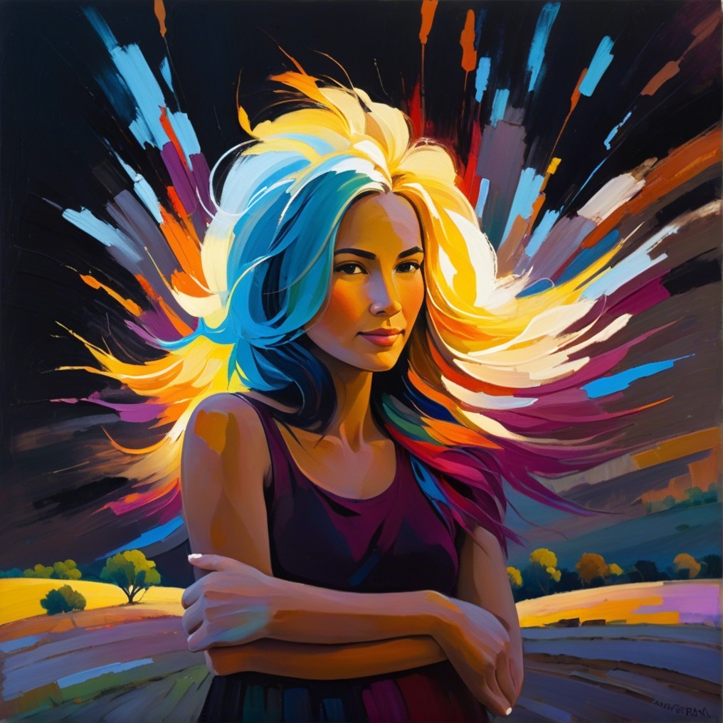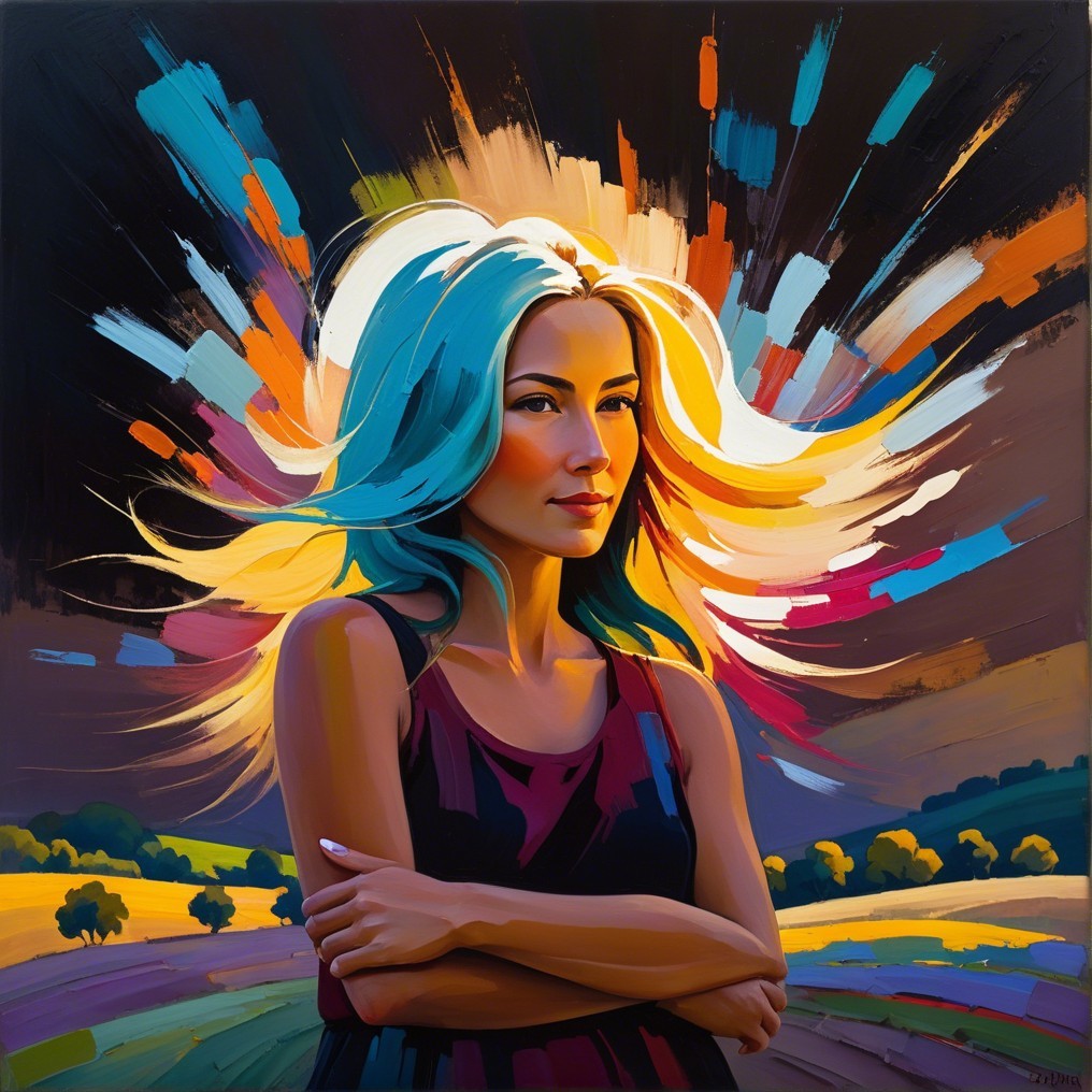 Vibrant abstract masterpiece, rural landscape setting, traditional woman portrayed boldly, heavy brushstrokes, woman standing tall in countryside, peaceful rural day, weathered hair, sturdy nose, earthy-toned background, rolling fields, gentle hills, cheerful and calm atmosphere, soft sunlight, dreamy and tranquil ambiance, fluid shapes, subtle details, expressive painting style, vibrant color palette, textured brushwork, dynamic composition, emotional depth, contemporary art style.
