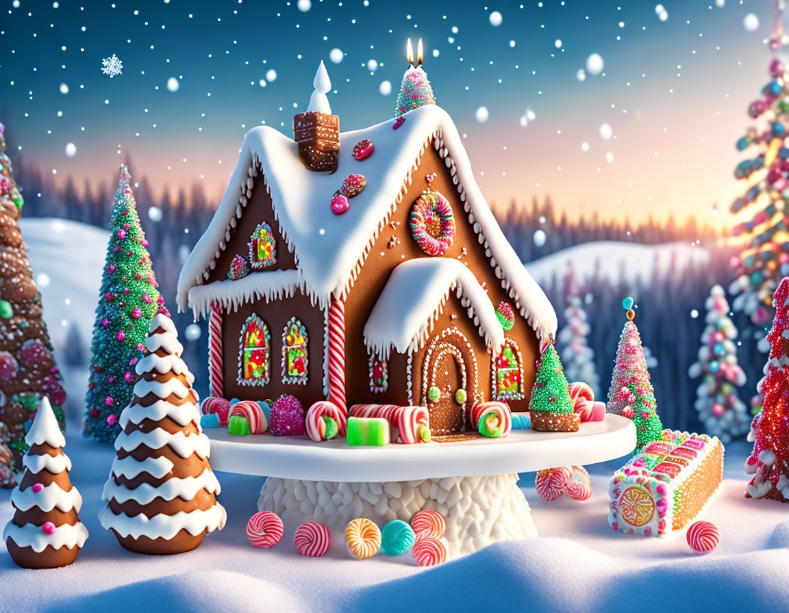 A birthday cake in the form of a cute gingerbread house intricately decorated with variety of candies and icing, on the transparent glass footed cakeplate, burning candles, on the window with a view of winter coniferous forest