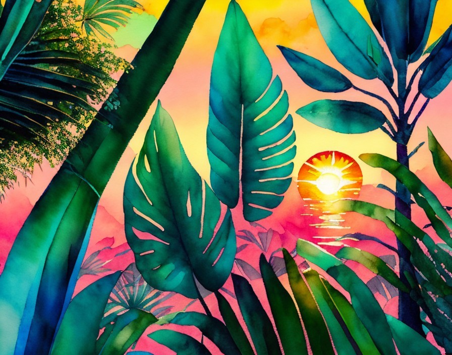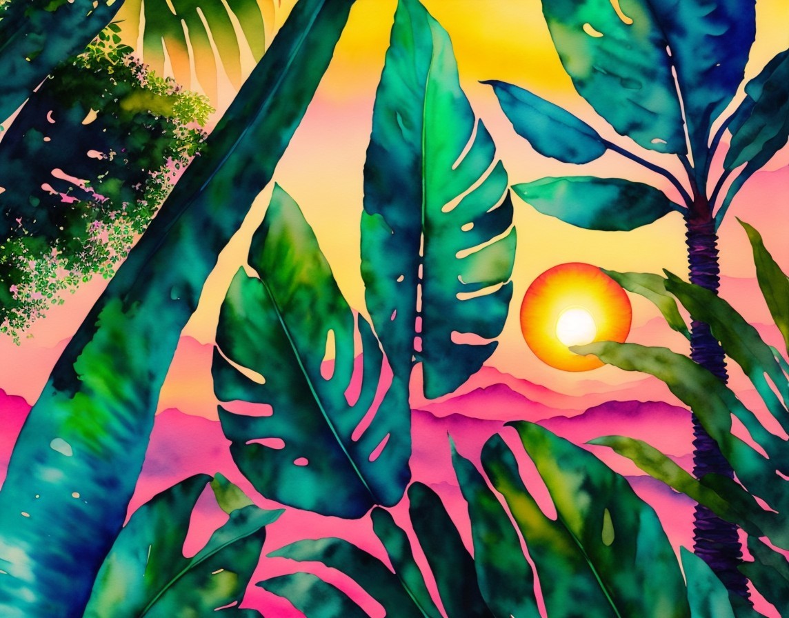 Colorful tropical foliage silhouette against a vibrant sunrise or sunset sky with warm hues of yellow, orange, and pink.
