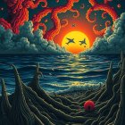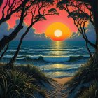 Vibrant Sunset Over Ocean with Silhouetted Trees