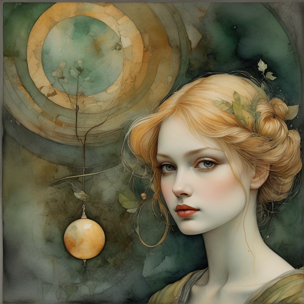 A tranquil portrait of a young woman in a green hat, surrounded by sunflowers. Her soft expression and delicate features blend harmoniously with a serene, nature-inspired background.