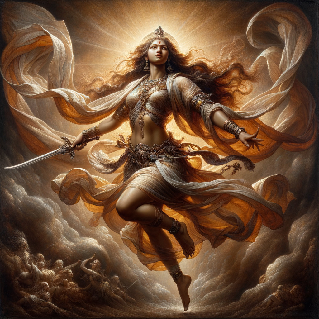 A fantasy-styled woman with a sword, wearing an elegant dress and ornate jewelry, stands poised and regal beside her reflection.