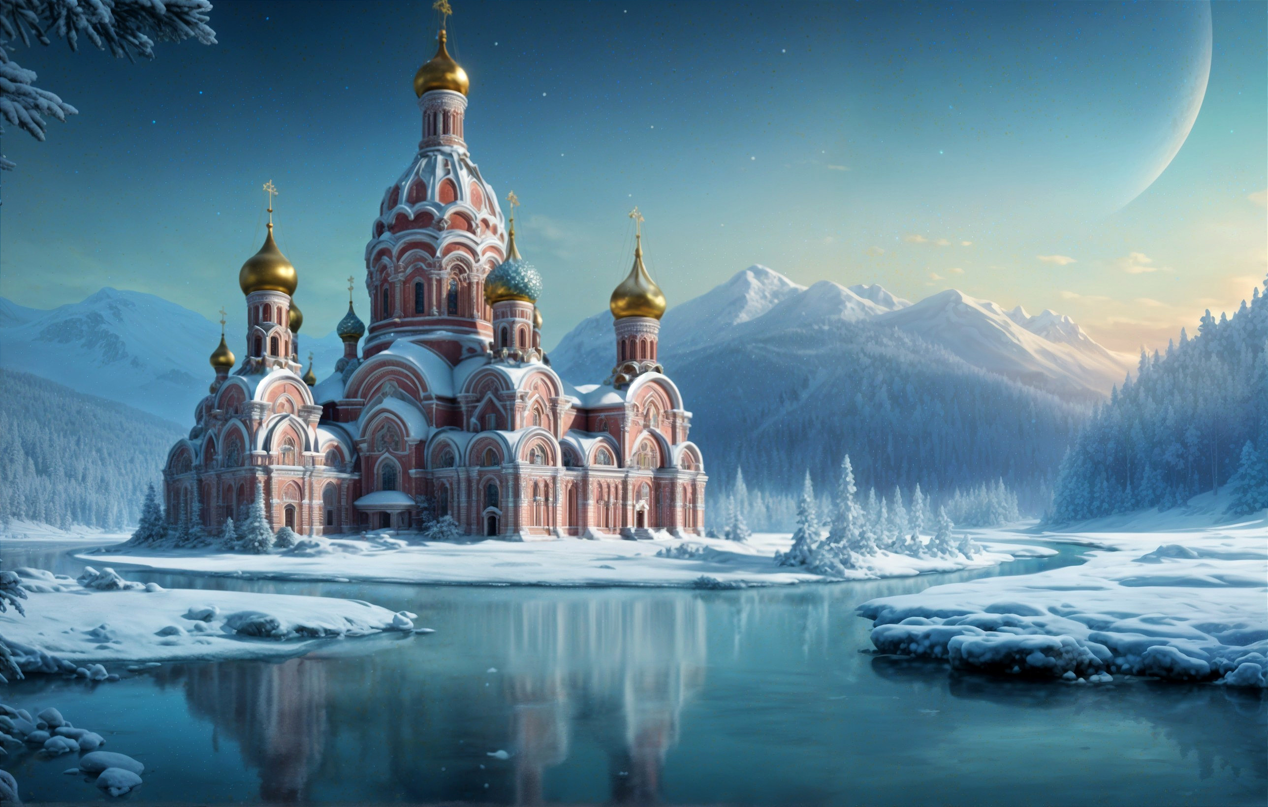 (Old Try from other user) - A stunning winter landscape features a majestic church with golden domes, nestled by a serene lake surrounded by snow-covered mountains under a starry sky and a large moon.
