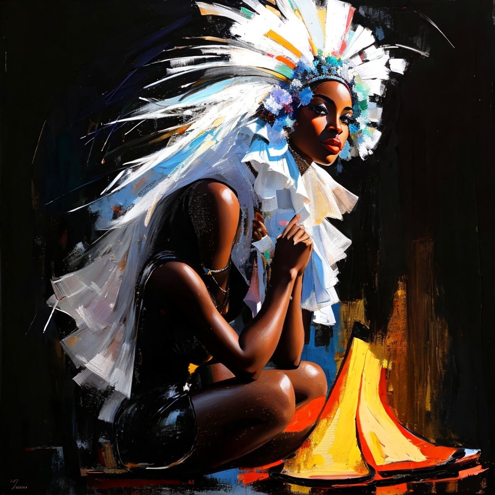This artwork features a striking woman with a beautifully styled head wrap adorned with colorful flowers. Her bold makeup and vibrant background of tropical leaves enhance her captivating presence.