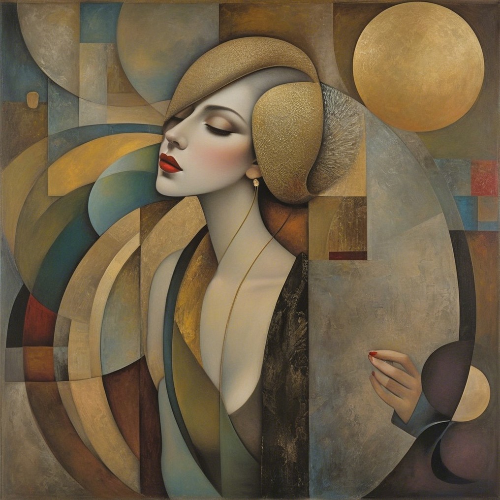 The artwork features an elegant woman with a stylish turban, exuding sophistication. She holds a perfume bottle, surrounded by abstract circular shapes and a warm color palette, evoking luxury.