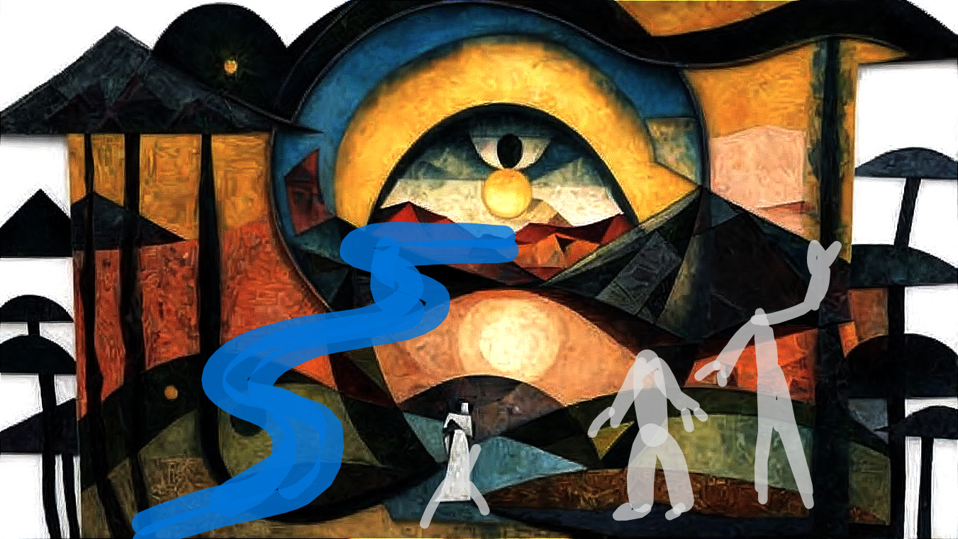 A vibrant, stylized landscape features a winding river surrounded by abstract trees and mountains. Silhouetted figures stand together, framed by a colorful sunset and blooming flowers.
