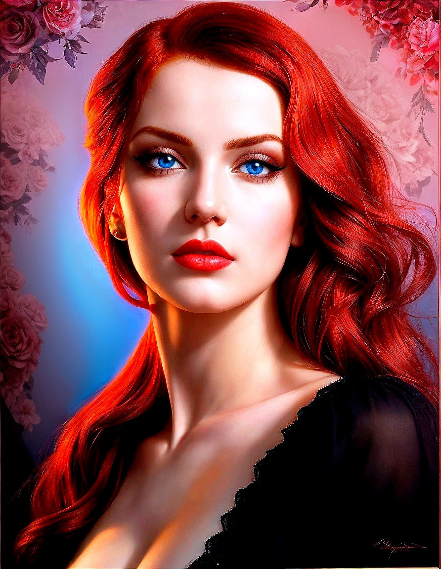 A digital artwork of a woman with striking red hair and blue eyes, surrounded by soft pink floral accents with a glow around her.