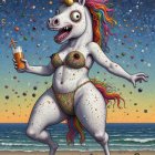 Prompt: "AI Generated Nonsense, A three-eyed, microscopic, nuclear fart unicorn with many eyes, wearing an exaggerated 'NECRO Bikini' for October, is depicted in a bizarre, joyous scene titled "Just enjoying life!". The artwork is rendered in the distinctive style of Jean-Baptiste Monge, incorporating the pointillist technique of Seurat, the dreamlike symbolism of Redon, and the frantic caricature of Gerald Scarfe, with splashes of vibrant, unnatural colors by LEBO art. Dynamic lighting emphasizes the absurd, otherworldly nature of the creature and its attire, with a hint of glowing nuclear energy."