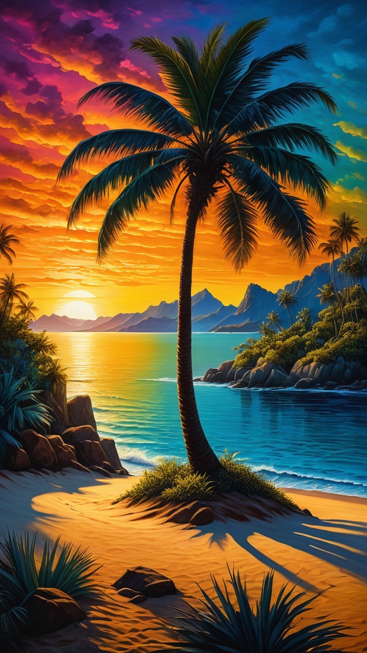 A vibrant sunset casts orange and purple hues over a tranquil beach scene, featuring a tall palm tree, gentle waves, and distant mountains, evoking a serene tropical paradise.