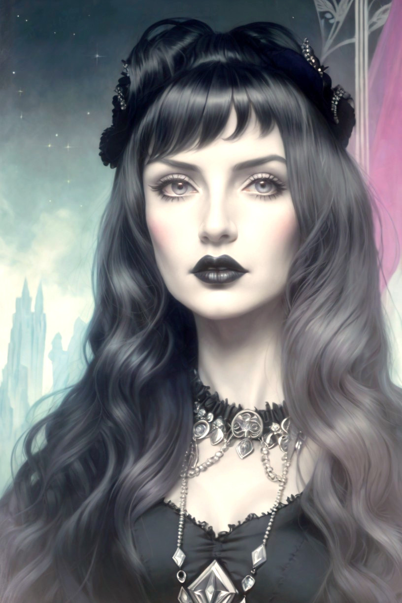 Portraiture in style of Georgia O'Keefe, Zdislaw Beksinski, Larry Carroll, Henry Darger, dejah thoris, Leonora Carrington. Stylized woodblock print, gothic rock woman with crystalline hair and frilly shirt, wide-angle perspective, stacked lines merge into hairdo, cotton cuts, pompous psychpomp scene, victorian garments, quilling, quaint, dethereal, detoriation, rust, metallic colors, metal brass details, steampunk 0 8, comical, high coloring 1.9, raytraced shadows 1.8, chiaroscuro lighting in background, dynamic lighting, concept art merged with movie poster art, beautiful artwork, perfect handsface, hues, grain, pointillism textures, dew drops patterns, echaustic strokes, shiny, glossy, quilling, quaint, folded paper style 0.6, traumacore 1.9, retrofuturistic details, Streamline_Moderne, soft edges, delicate coloring, tetradic color scheme beige blue purple grey, Pastel colors of blue and pink, vaporous lighting from top, iridescent accents, spiritual essence, beautiful composition, shadow mapping 1.3, raytraced shadows 1.8, subsurface scattering 1.7, back-lit, 3d effects 1.9, ambient occlusion 1.5,
