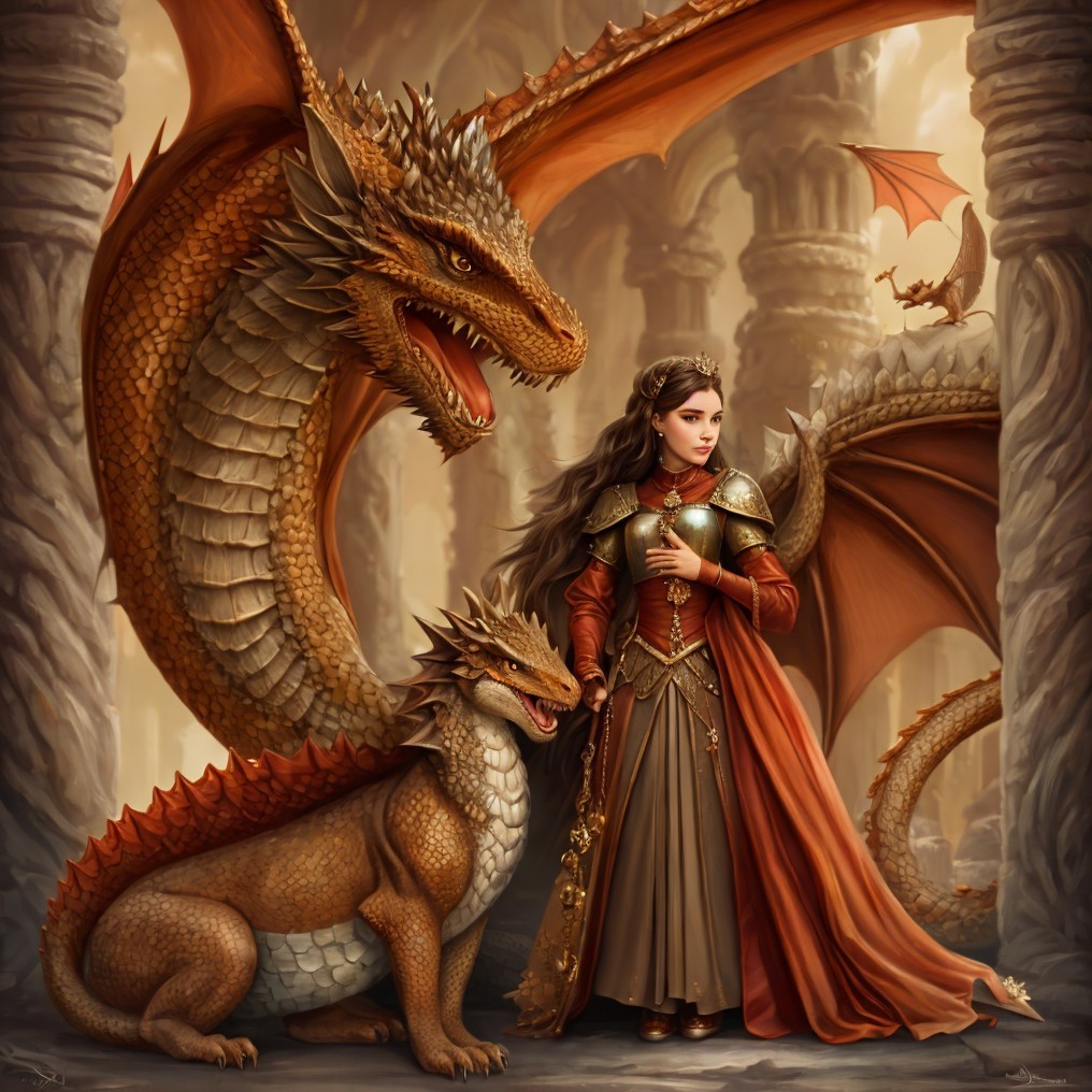 A queen in regal attire stands with three dragons amidst towering castle spires.