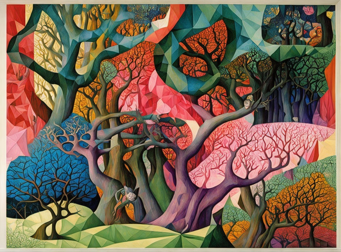 A vibrant, abstract landscape featuring a mosaic of trees in various colors and geometric shapes, blending reds, pinks, blues, and greens, creating a surreal, dreamlike atmosphere.