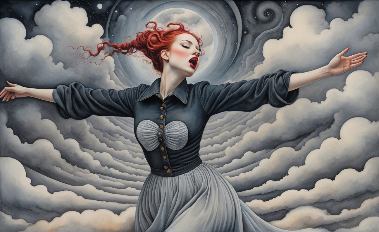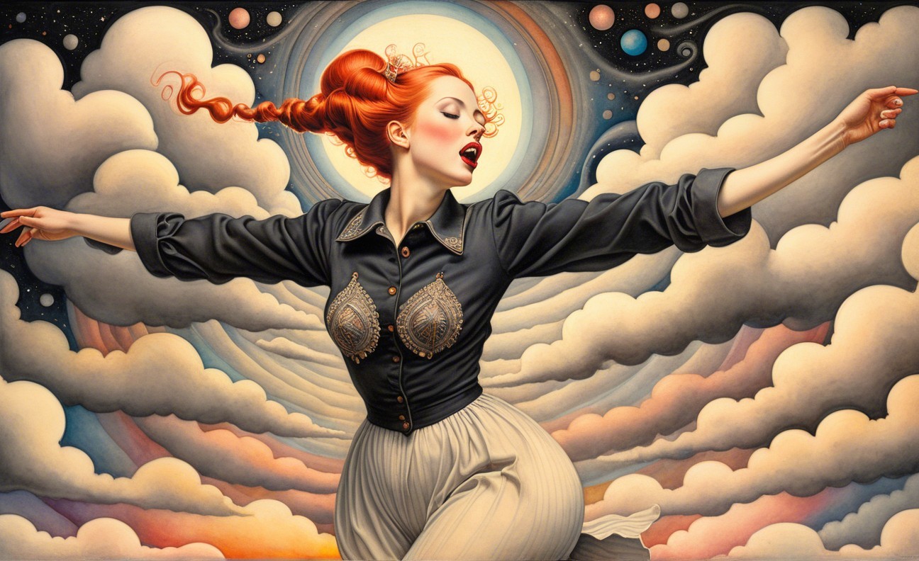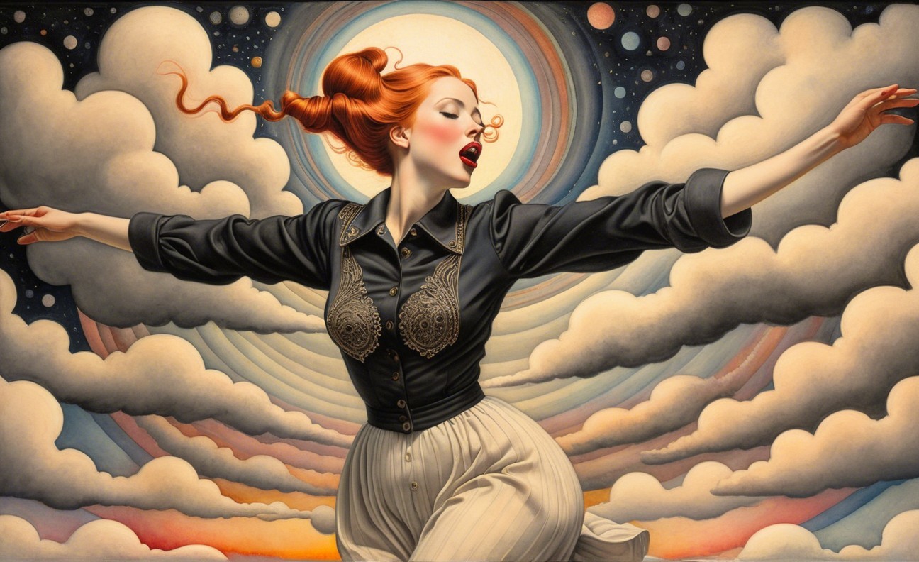 Prompt: Female in ecstasy, precisionism by Morton Livingston Schamberg. Intricate ink, watercolor and chalk masterpiece, Ed Binkley-inspired style, surreal composition influenced by Benno Hauber and pop-surrealism of Paul Kidby, reminiscent of Mark Ryden and Man Ray, levelled off in high plasticity, flabbergasted, excited, exaggerated brightness 1.9, intricate hips and groin, pointilism reference, red lips, very colorful make-up, overexposed lighting, perpendicular edges, great depth and scale, rounded and surreal background without edges, warped landscape as grey and cloudy backdrop, infused with cymatics elements, vibrant color shapes, and asymmetrical flares reminiscent of Miro's style. The artwork should be unique, witty, detailed indiecore with a touch of fantasy. Tetradic color scheme dark-grey light-grey deep-blue metallic-honey, warped accents, flares and panels, estranged coloring, acceptance of moving, asymmetrical upper body portrait. Displacement mapping 1.3, mip-mapping 1.1, parallax occlusion 1.3, polished, grain, hues by Ho Baron, quilling, airy, complex airbrush textures, HDR, blurred watercoloring, airbrush effect, Raytraced shadows, divisionism techniques, luminism, sfumato-effect, cloudy depictions integrated in a liminal mosaic, anisotropic filtering, close-up, detailed clothing with crackles and filaments, stylized linework illustration featuring intricate gouache details and defined dry ink brush outlines, warped cloud motif, tendrils, ivy-like linework shapes, simplistic fractalization in rural decay, bas-relief 1.8, plasticity 1.8, highly fragmented flares, gradient colored stripes, natural inking vibe, various tones of grey in gradients, rectangular shapes in background, stylized styles of Georgia O'Keeffe and Lyonel Feininger and Emily Balvet