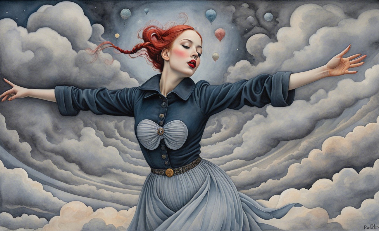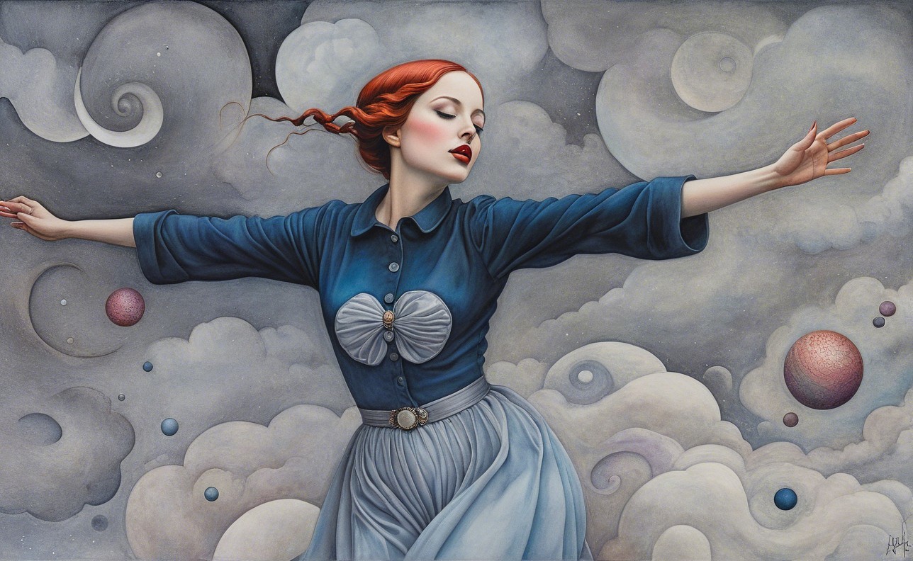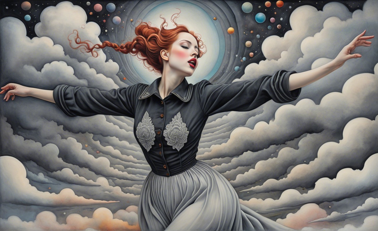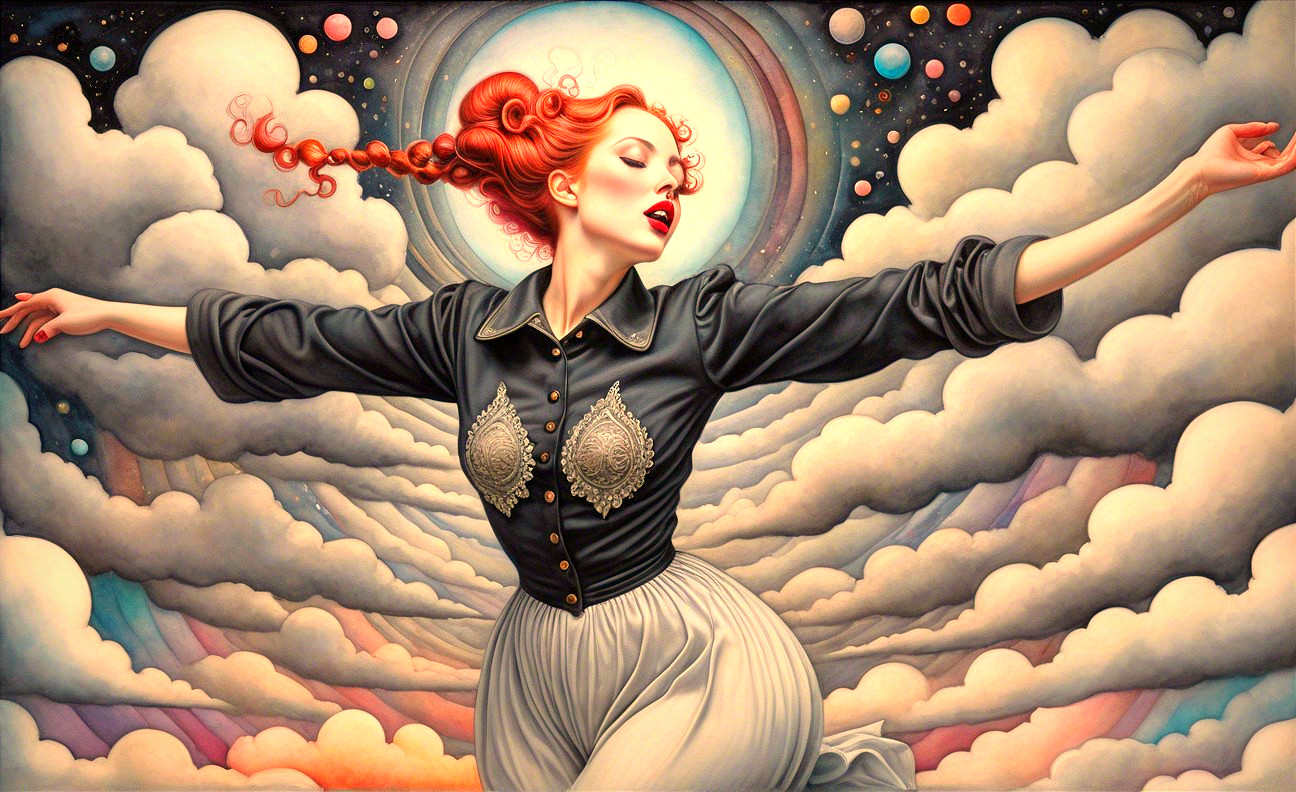 Prompt: Female in ecstasy, precisionism by Morton Livingston Schamberg. Intricate ink, watercolor and chalk masterpiece, Ed Binkley-inspired style, surreal composition influenced by Benno Hauber and pop-surrealism of Paul Kidby, reminiscent of Mark Ryden and Man Ray, levelled off in high plasticity, flabbergasted, excited, exaggerated brightness 1.9, intricate hips and groin, pointilism reference, red lips, very colorful make-up, overexposed lighting, perpendicular edges, great depth and scale, rounded and surreal background without edges, warped landscape as grey and cloudy backdrop, infused with cymatics elements, vibrant color shapes, and asymmetrical flares reminiscent of Miro's style. The artwork should be unique, witty, detailed indiecore with a touch of fantasy. Tetradic color scheme dark-grey light-grey deep-blue metallic-honey, warped accents, flares and panels, estranged coloring, acceptance of moving, asymmetrical upper body portrait. Displacement mapping 1.3, mip-mapping 1.1, parallax occlusion 1.3, polished, grain, hues by Ho Baron, quilling, airy, complex airbrush textures, HDR, blurred watercoloring, airbrush effect, Raytraced shadows, divisionism techniques, luminism, sfumato-effect, cloudy depictions integrated in a liminal mosaic, anisotropic filtering, close-up, detailed clothing with crackles and filaments, stylized linework illustration featuring intricate gouache details and defined dry ink brush outlines, warped cloud motif, tendrils, ivy-like linework shapes, simplistic fractalization in rural decay, bas-relief 1.8, plasticity 1.8, highly fragmented flares, gradient colored stripes, natural inking vibe, various tones of grey in gradients, rectangular shapes in background, stylized styles of Georgia O'Keeffe and Lyonel Feininger and Emily Balvet