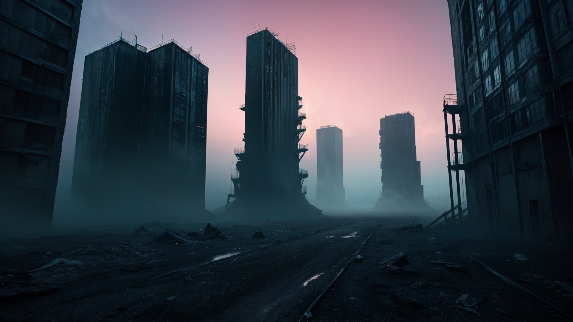 The image depicts a haunting, post-apocalyptic landscape with towering, crumbling buildings shrouded in fog. A dramatic pink and purple sky adds a surreal atmosphere to the desolation.