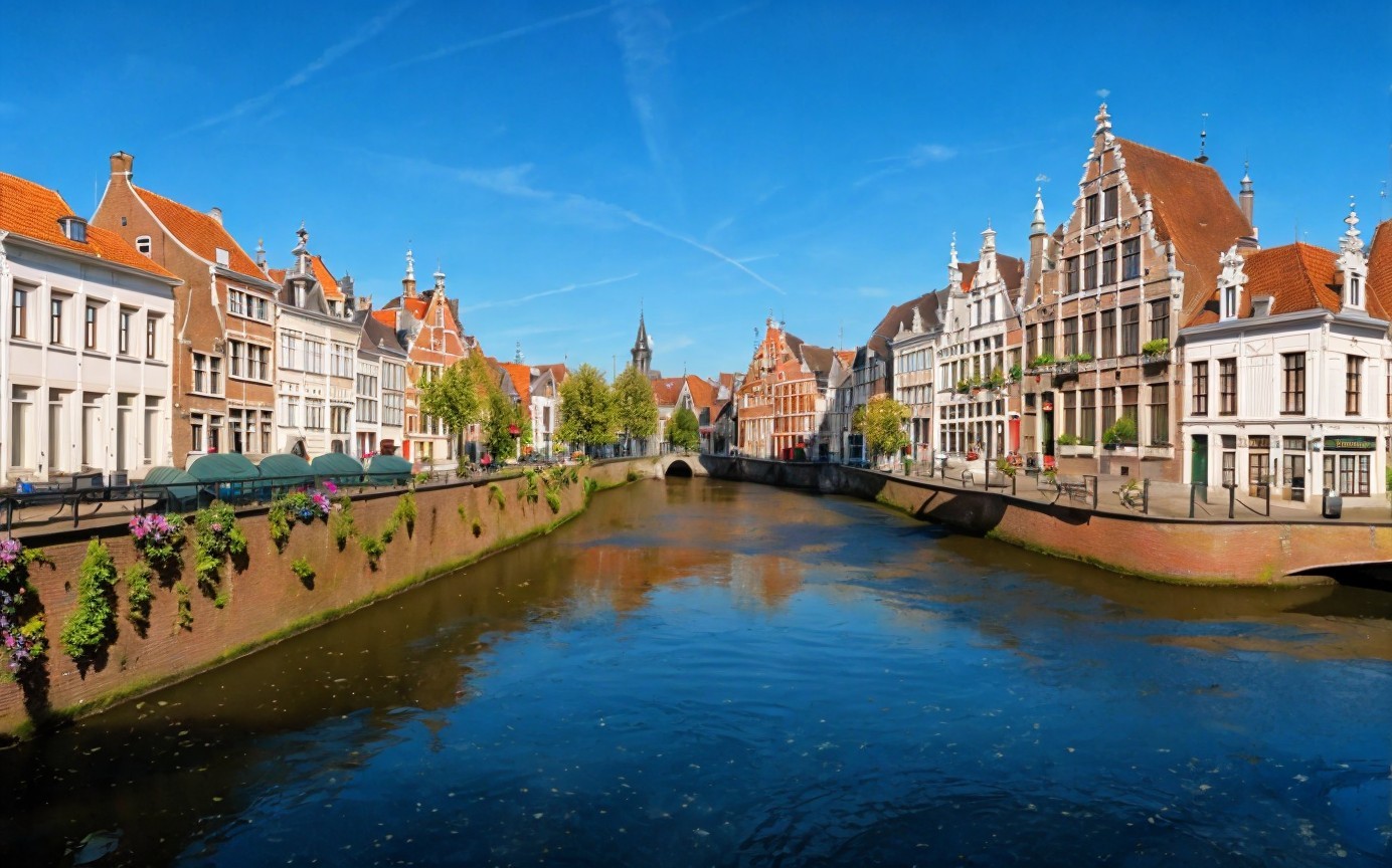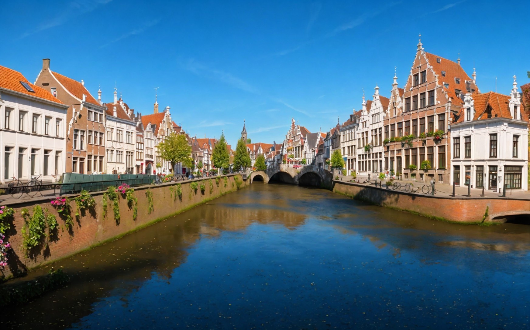 A picturesque canal with arched stone bridge flanked by traditional European buildings under a blue sky.