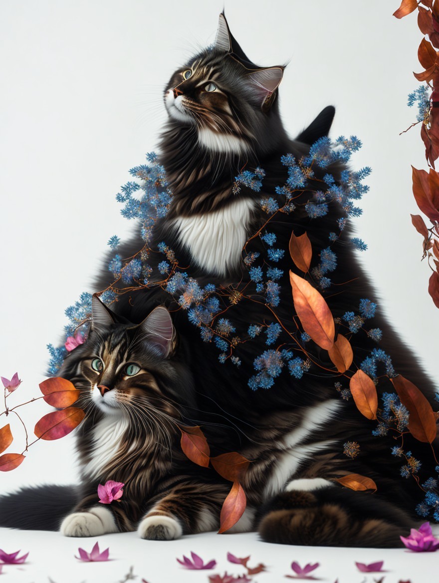 A majestic cat with a lush, flowing coat sits gracefully, surrounded by vibrant autumn leaves. Its eyes gaze upward, embodying elegance and serene beauty against a minimalist background.