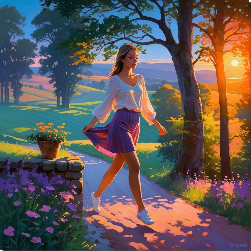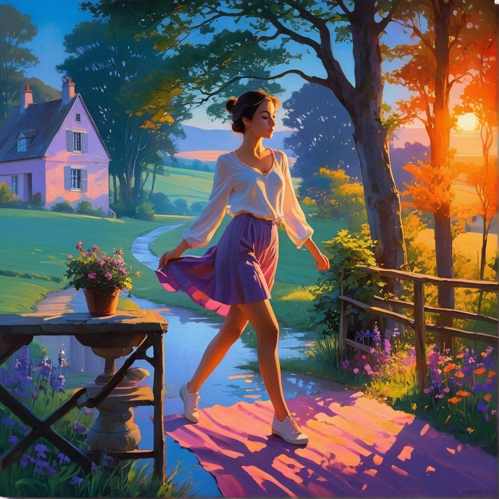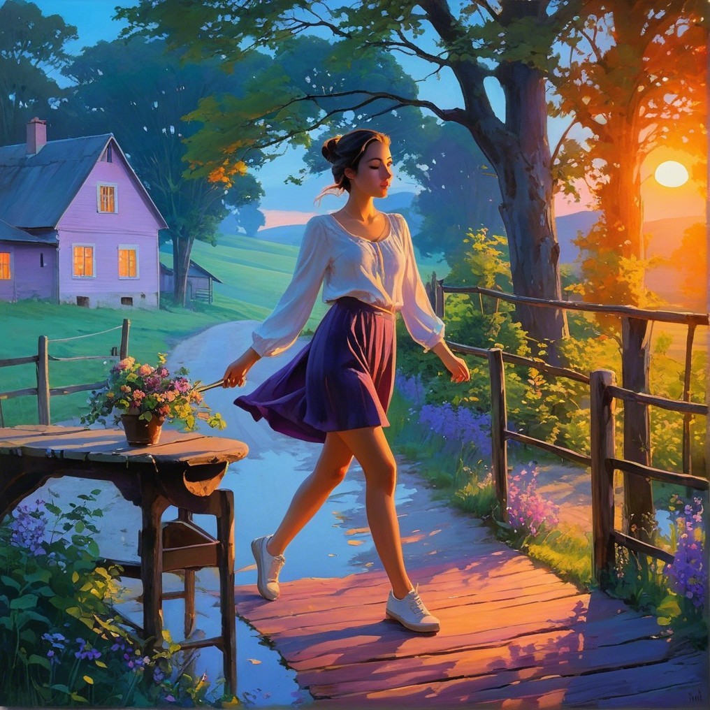 A gentle stream meanders through the landscape, its waters gleaming with the reflection of the sky’s fiery hues. The wooden bridge, where the young woman stands, serves as a quiet crossing between the quaint home and the open countryside, inviting a slow, contemplative stroll through nature’s beauty. The entire setting radiates a peaceful magic—the kind of summer evening where time seems to pause, wrapped in the golden embrace of the sunset.