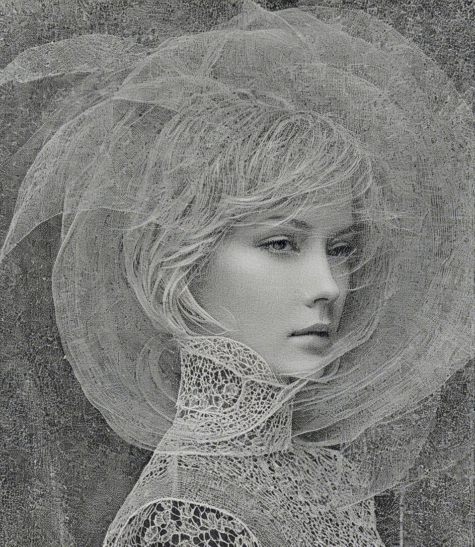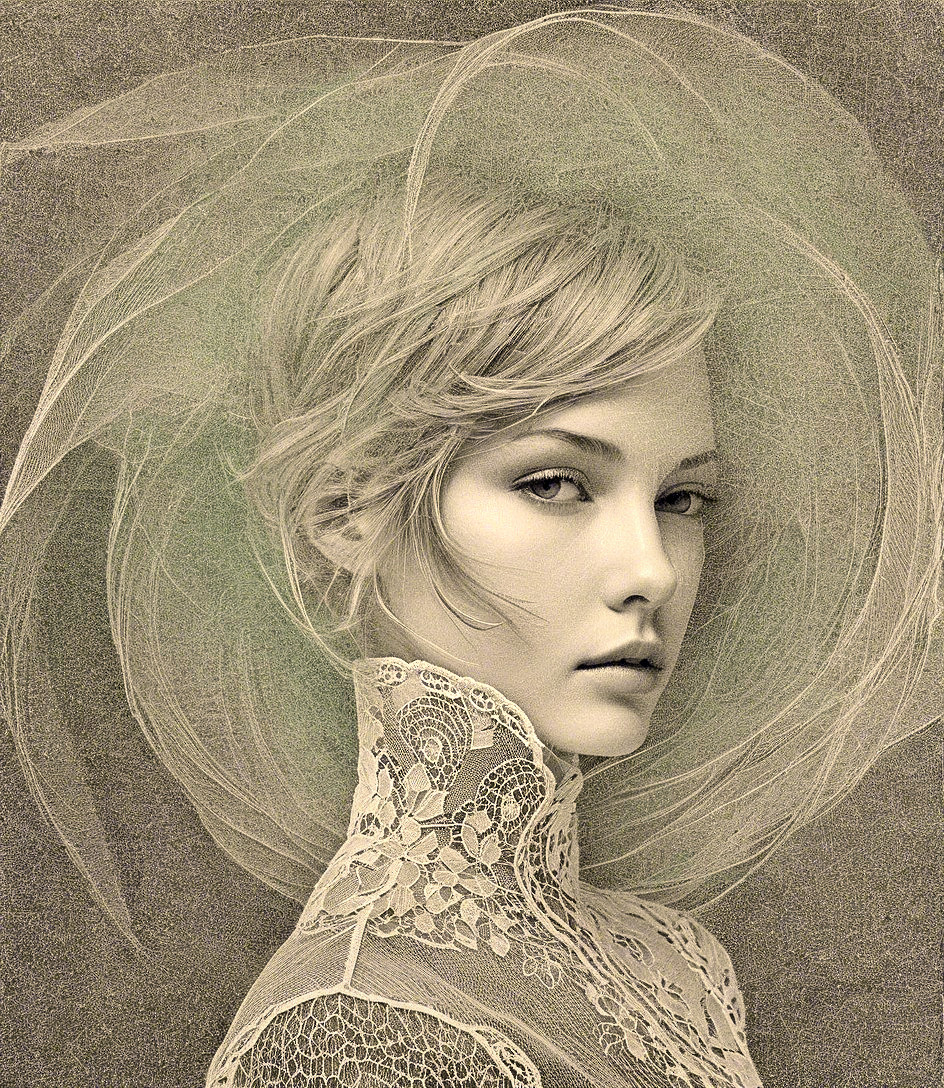 + Prompt:Organic headshot, double exposure effect and intricate textures, drawing inspiration from the stylistic illustrations akin to Erica Hopper, the image presents a blend of blurred and contoured elements. The viewpoint should be slightly angled, offering a top to bottom perspective, capturing a serene expression. Channel the essence of plasticity and embodiment reminiscent of Edward Gorey and Vincent DiFate. Ensure the image is full-sized, with a multi-layer rendering at the highest resolution. Triadic color scheme sea-green light-green yellow-green, embrace resilience and rigidity in the composition, playing with asymmetry and a Byzantine face type. Create a captivating contrast by darkening the left side, enhancing the stylized hues with gradient inking colors, intertwining gouache and watercolor for a unique effect. Craft a feminine headshot featuring a vibrant and tousled hairdo, creating an illusion of flowing hair with 3D effects reminiscent of Brock Hofer. Opt for a plasticity of 1.8, incorporating dappled, opaque layers with multi-layered eyes that hold a distinctive gaze.
