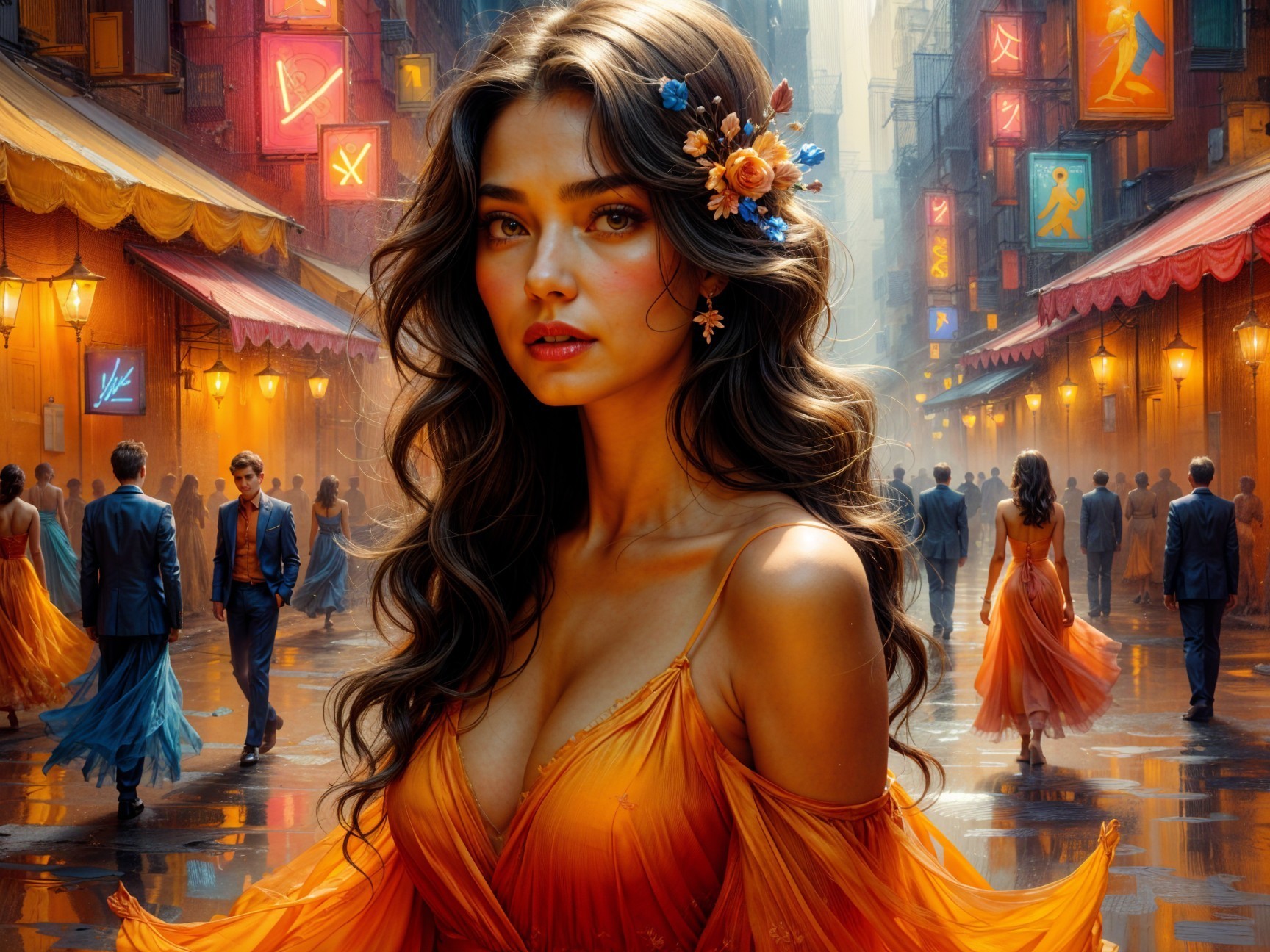 A vibrant night scene in a bustling city, featuring a woman with flowing hair in a stunning orange dress, surrounded by colorful lanterns and lively crowds, capturing an enchanting atmosphere.