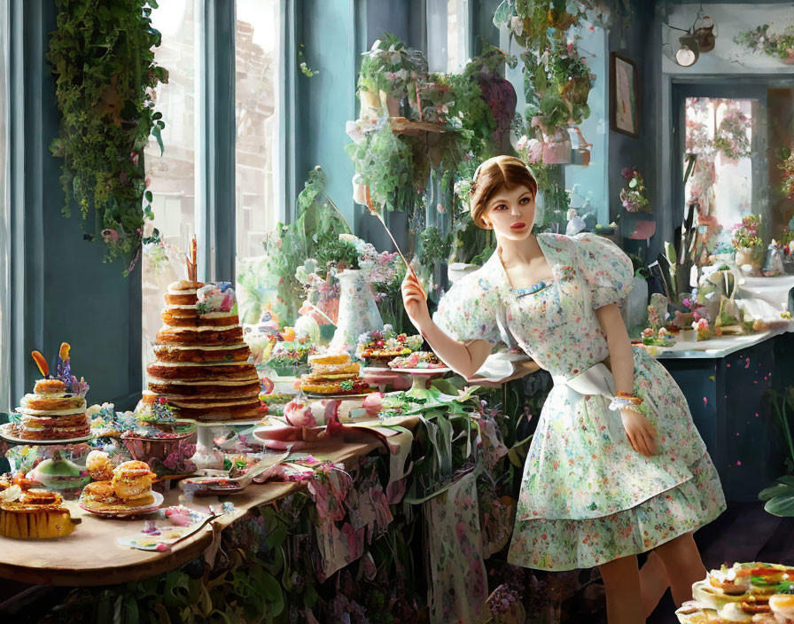 Girl in frilly dress baking in the kitchen, lots of cakes and pastries around her, monstera, messy modern kitchen, highly detailed realistic oil painting triadic colors Unreal Engine Claude Monet Clamp, Hayao Miyazaki, Yoshitaka Amano, Erin Hanson, Wadim Kashin, Johannes Vermeer, Dagna Majewska
