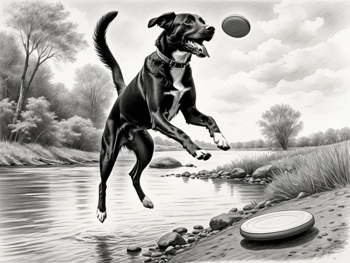 A joyful girl sits on a path by a river, happily playing with her leaping black dog. Their lively interaction captures a moment of pure happiness and companionship in a serene setting.