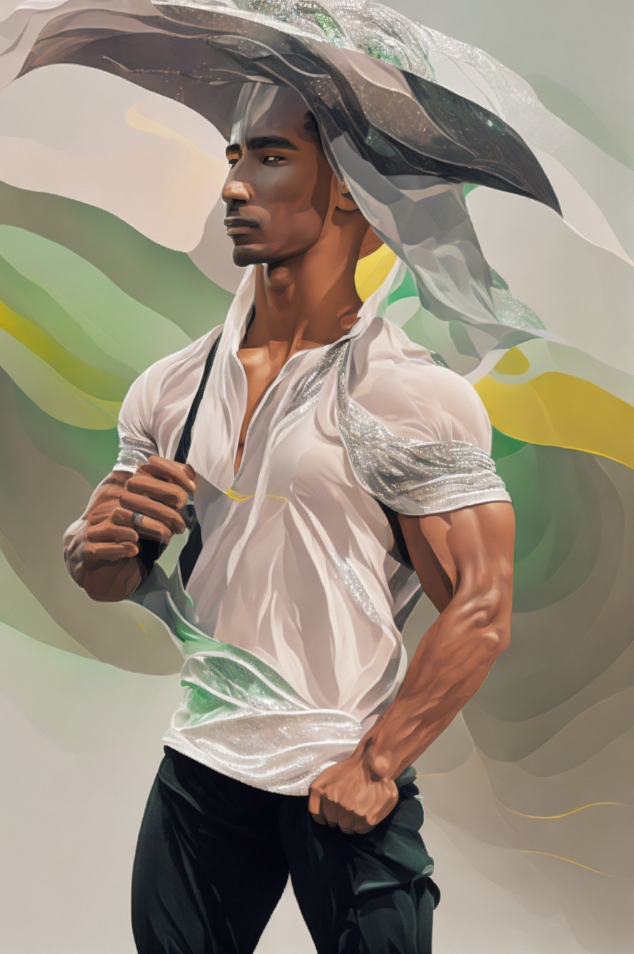 A confident Black man with a well-defined physique is depicted in a medium shot, looking off to the left side of the frame with a determined expression. He wears a sheer, white, short-sleeved top with a v-neck opening and a silver-patterned trim on the sleeves and