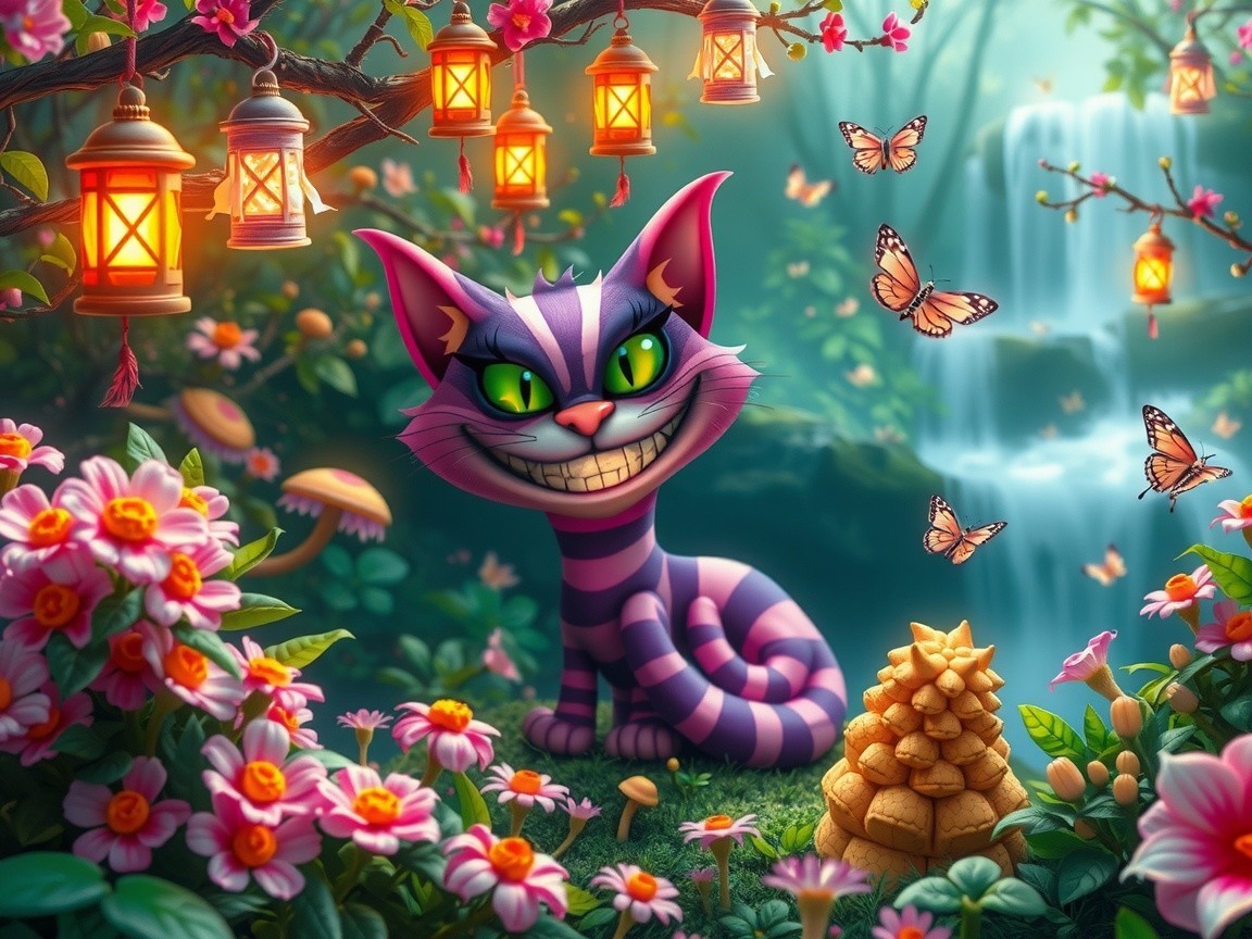 In a whimsical forest glade, a vibrant purple and pink striped cat with large, mischievous green eyes smiles amid colorful mushrooms and glowing lanterns, with a gentle waterfall in the background.