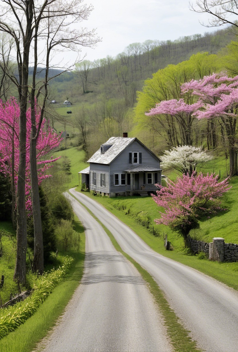 + Prompt:A gray shabby house in a beautiful natural Springtime countryside. The contrast between the house of a poverty stricken family in Appalachia and the lush Springtime environment around it. Blooming Dogwood and redbud trees and other trees newly leafing out as well.
