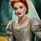 A stunning regal woman with elegant red hair styled in vintage waves, adorned in a shimmering silver gown. She wears a tiara and sparkling jewelry, set against a mystical castle backdrop.