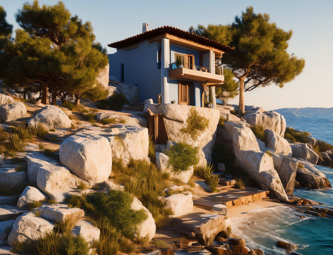 small Greek house by the rocky coast, (blue roofs), blue windows, white walls, grass, stone paths, sunny sky, pine trees in background, cinematic view