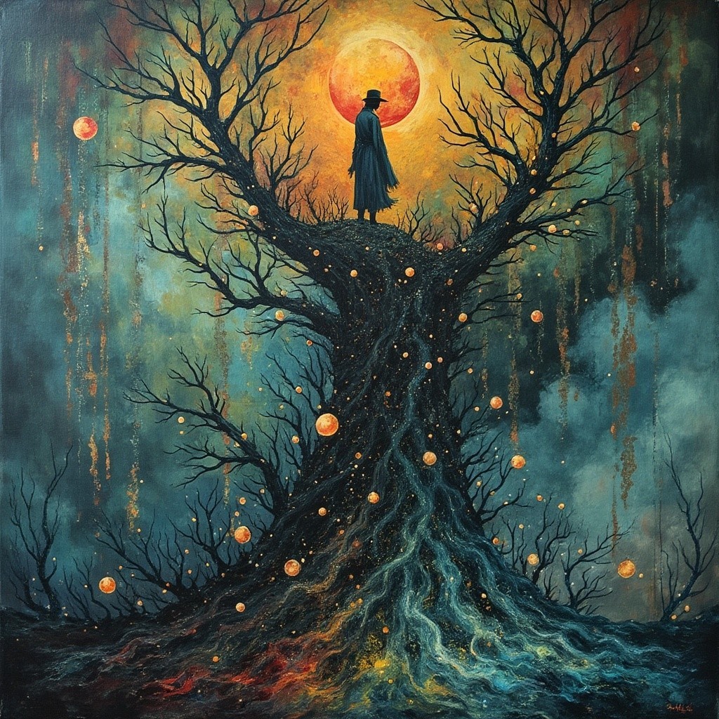 A mystical scene featuring a towering tree with lanterns, set against a vibrant sunset. A figure in a cloak stands atop, blending nature and magic, embodying tranquility and wonder.