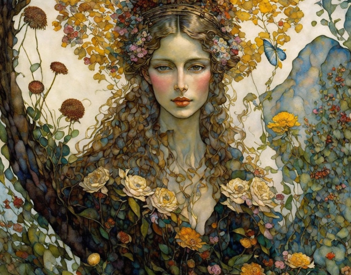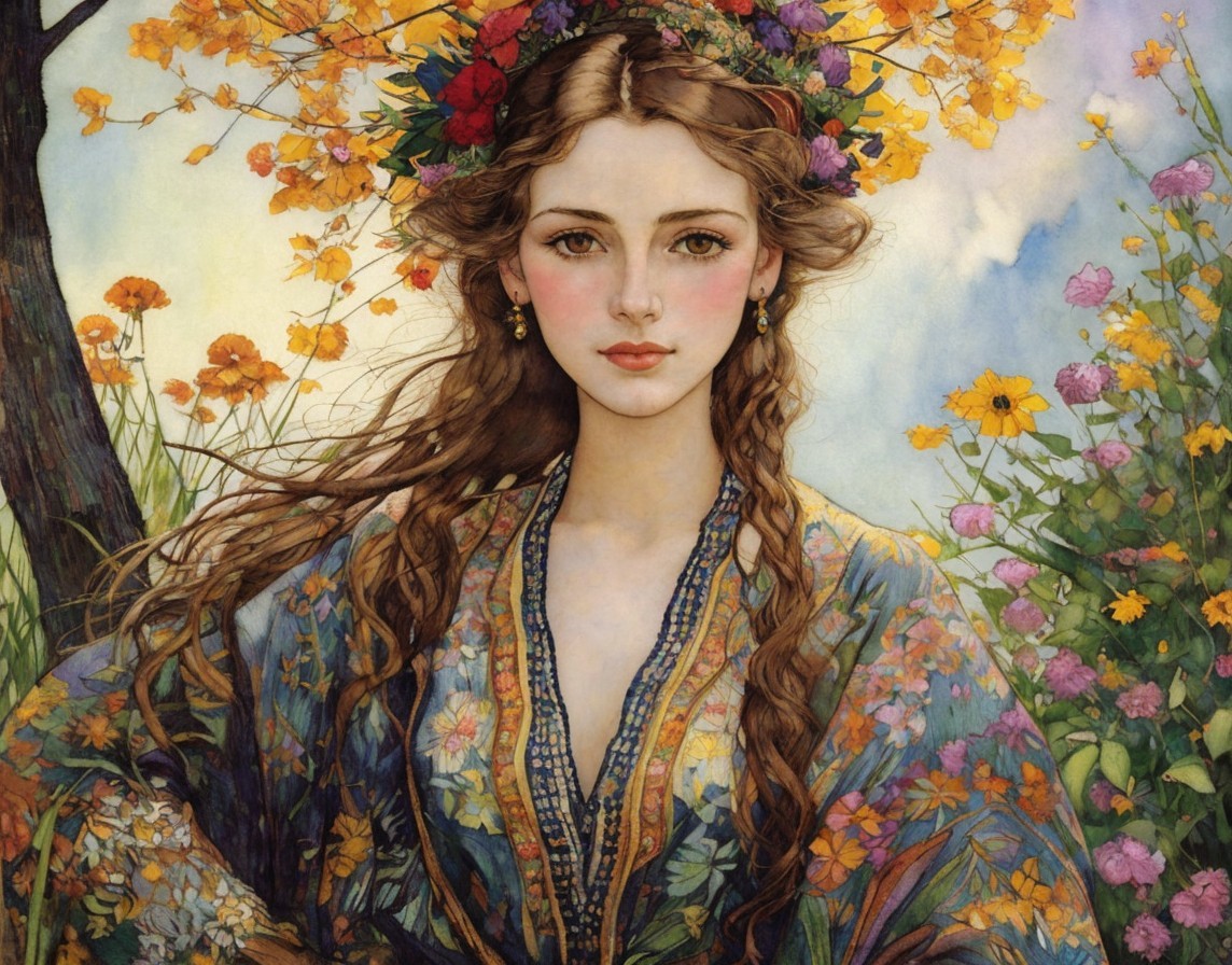 A digital painting of a woman with an intricate halo-like background, wearing a blue dress and a headband, exuding a classical beauty.