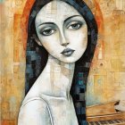 A captivating watercolor portrait of a young woman with long, dark hair and a red beret. She gazes softly, with birds perched around her, set against a warm, textured background.