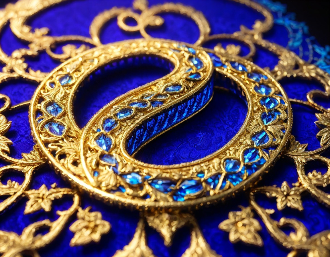 Prompt: "the letter S made of intricate lacey gold filigree intertwined with vines that have tiny blue flowers, gleaming gold, neon blue. Background; dark royal blue"