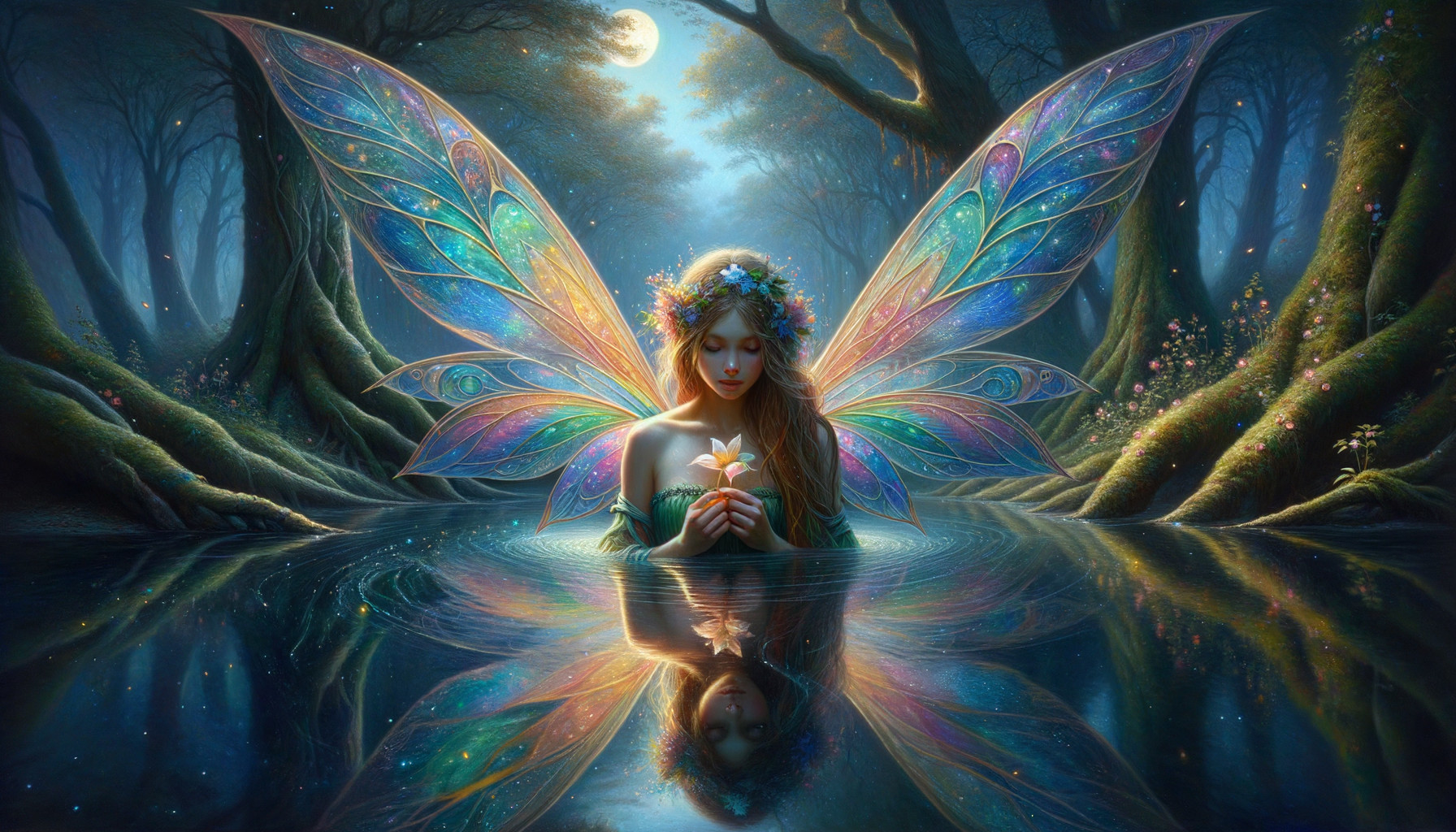 The pool’s surface is a mirror to the heavens, capturing the celestial dance of stars and moon. Gentle ripples disturb its stillness as the fairy princess dips her bare feet into the water. In her hands, she cradles a single, luminescent moonflower—the last of its kind—its petals glowing softly.