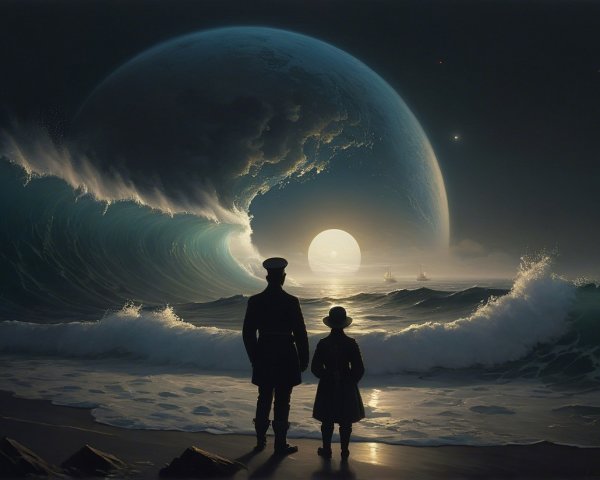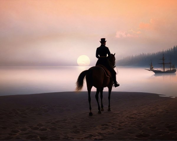 A majestic castle towers atop rugged cliffs, bathed in twilight hues. A lone figure on horseback gazes towards distant ships, while dramatic clouds add depth to the enchanting landscape.