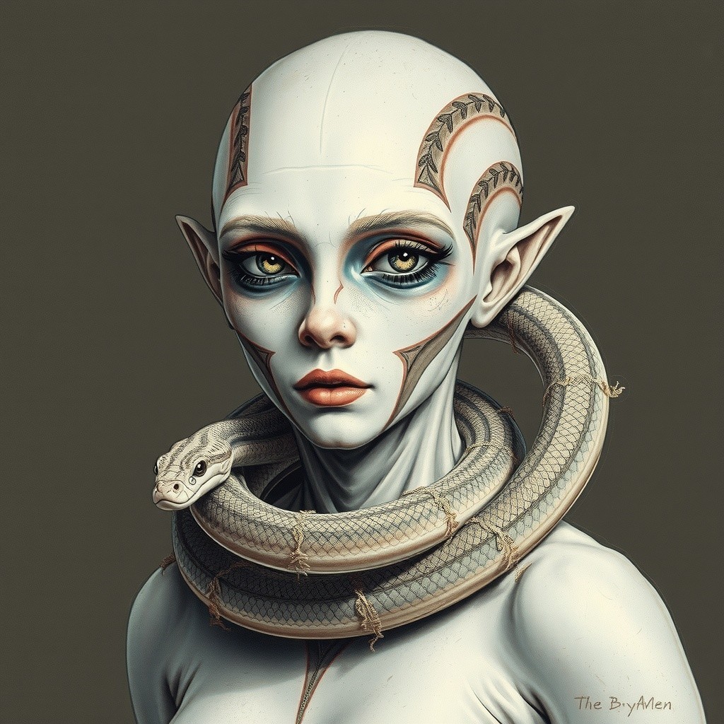 An illustration of a woman with a headband, jewelry, and a snake around her neck, against an archway backdrop.