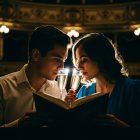 A romantic scene depicts a couple sharing an intimate moment at a lavishly decorated table with champagne glasses. Swirling colors in the background enhance the dreamy atmosphere.