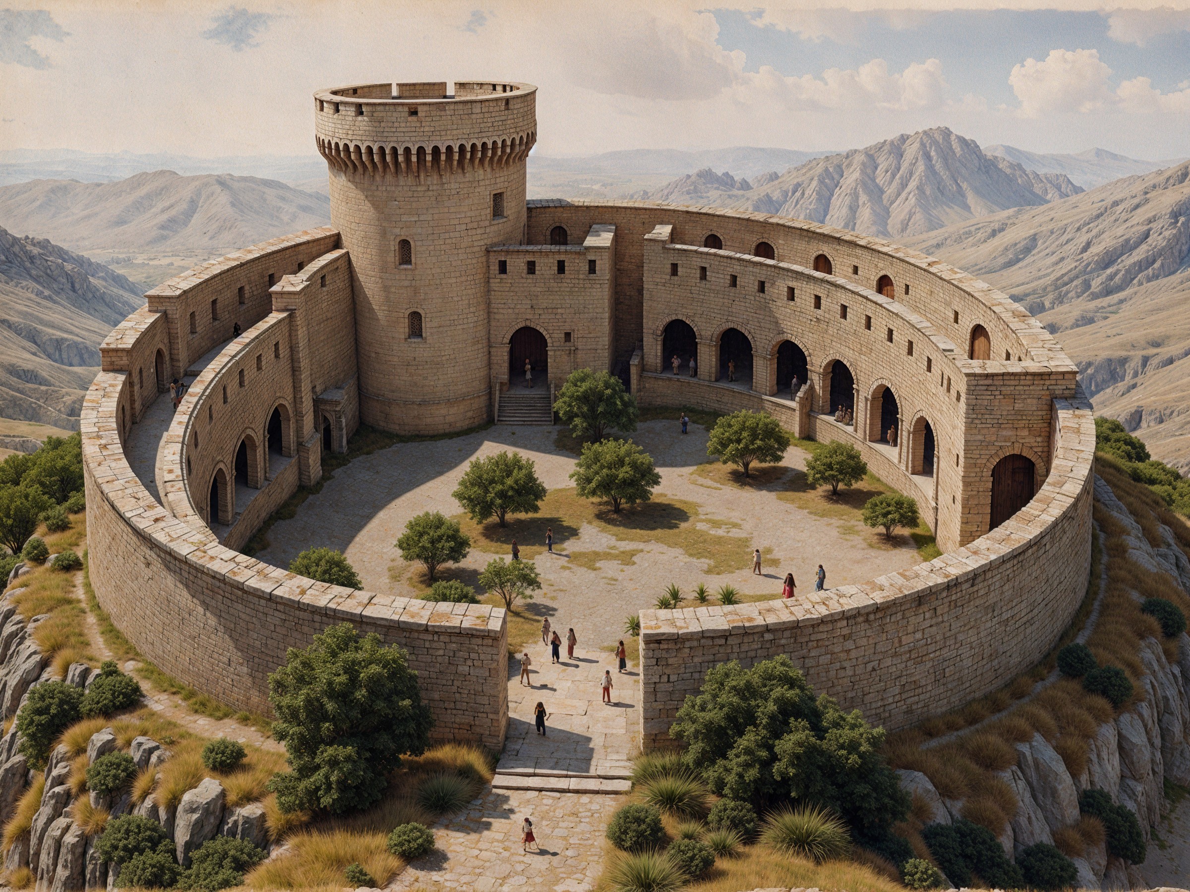 The image shows a circular stone complex with arches and terracotta roofs, surrounded by lush green hills. A serene courtyard is in the center, enhancing the tranquil atmosphere of the setting.
