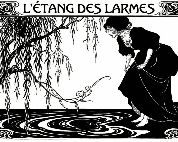 A silhouette of a woman in vibrant, patterned attire, sipping tea at an outdoor table adorned with flowers. A picturesque landscape with cherry blossoms and a blue sky completes the scene.