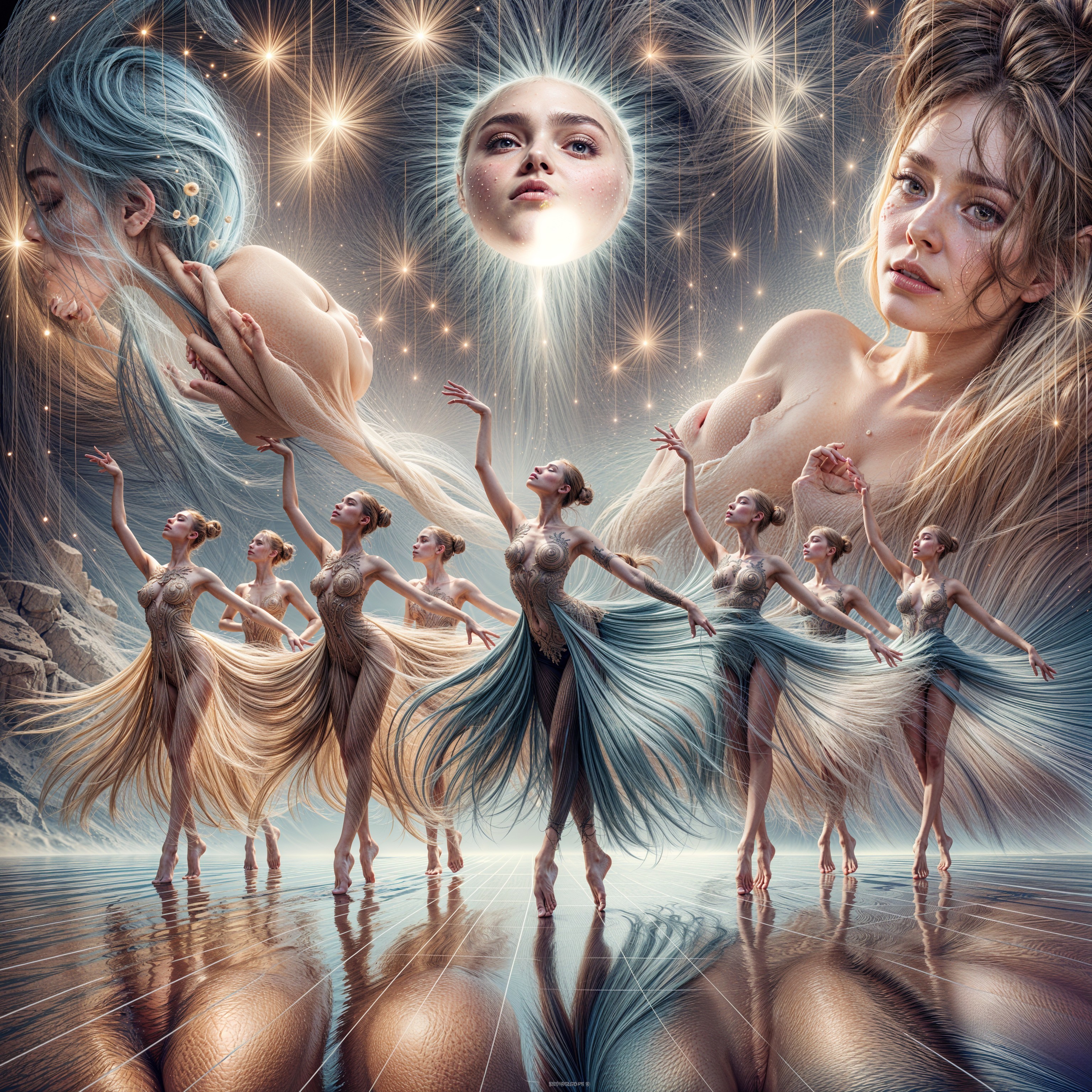 An artistic portrayal of multiple ethereal female figures in ballet poses under a luminous full moon.