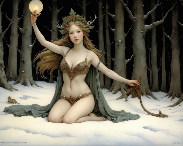 A woman in a flowing red gown stands elegantly in a dimly lit room, surrounded by celestial orbs and vibrant decorations. A golden bird rests nearby, adding whimsy to the enchanting scene.