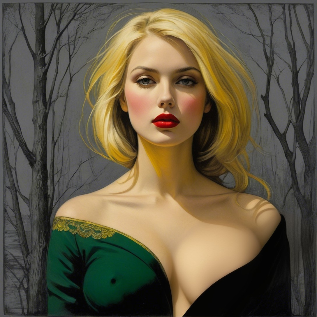 A striking portrait of a woman with blonde hair and bold red lips, set against a muted background of bare trees. She wears a dark green dress with delicate lace detailing, exuding confidence and allure.