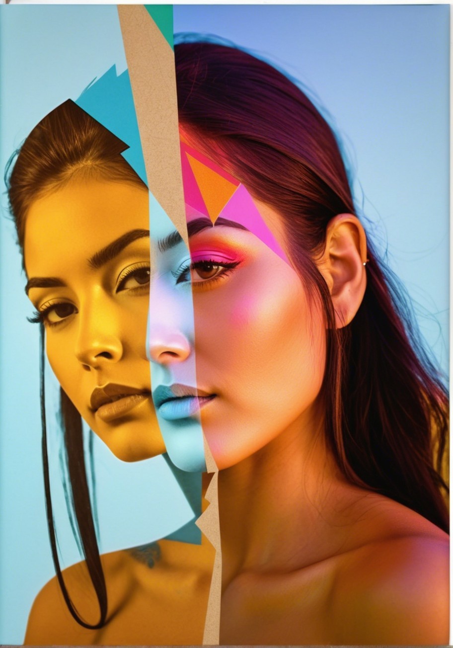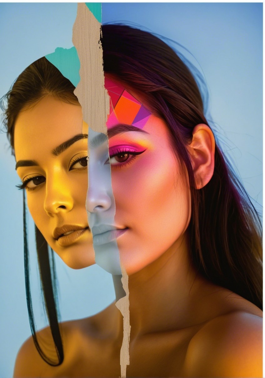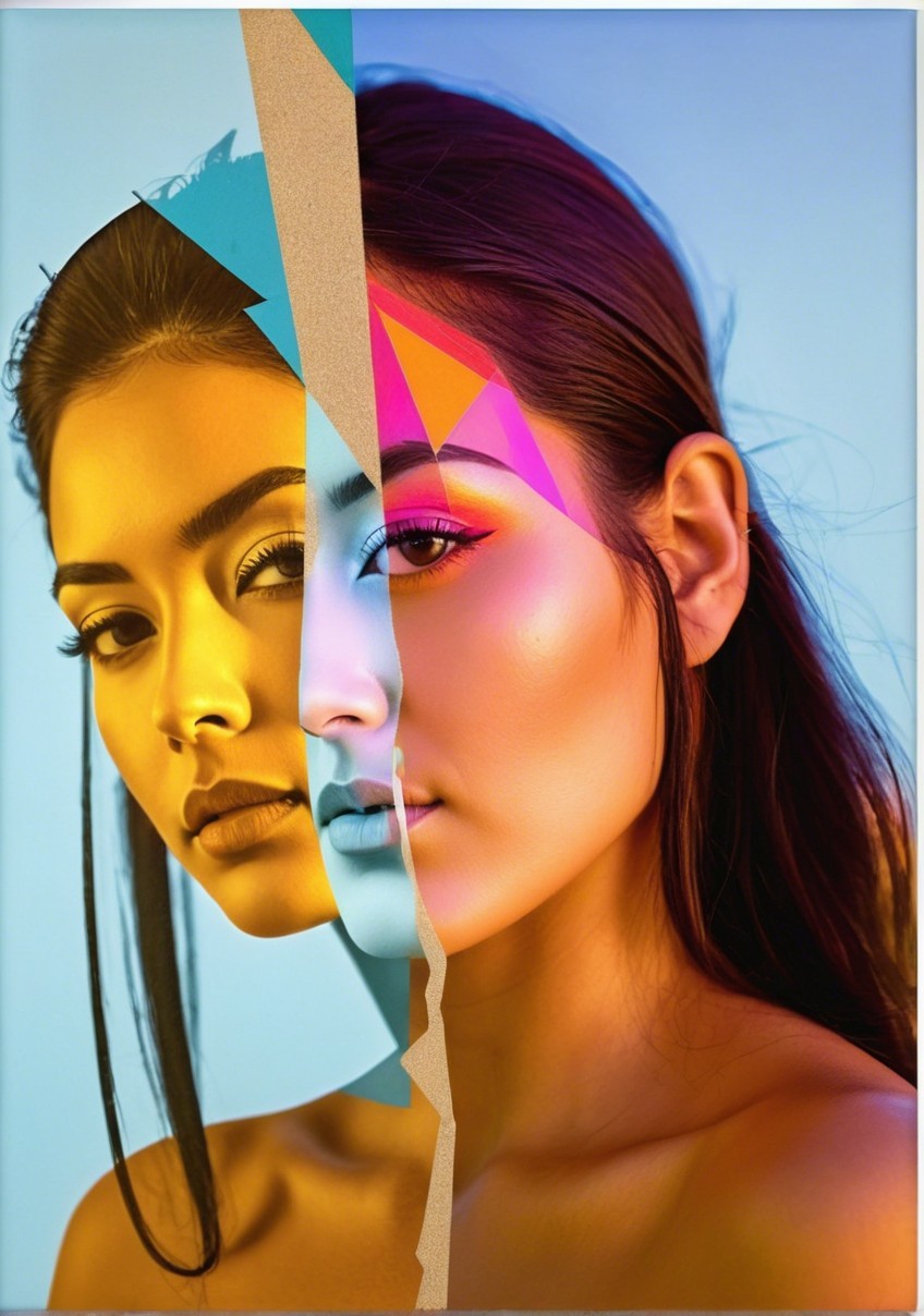 Prompt: Geometric portrait with lineage and line-art fusion, double exposure effect, distracted retro psychedelic Juminocore and scratchbook art blend, stylized woodblock print with airbrush overspray, collage, enchanting color flares, collagraphy with thinned smeary paint, portrayed with lavish expression, familiar, distressed background, scratches, only curves in zentangle style fractalisation, nuanced stylization, highly detailed, subtle, stylized burnt-orange details in geometrical background, flares, zentangle, tetradic color scheme dark-blue metallic-honey baby-blue azure, soft ethereal volumetric light cascading through a feminine figure, inspired by Milo Manara's style, featuring a grainy texture for a vintage touch. The composition is intentionally asymmetrical, drawing focus on the illuminated subject, visible textures to add depth and character to the image. Opt for a square aspect ratio of 1:1 with a high quality of 750 pixels. Enrich the color palette with brightened hues to create 3 point lighting, balanced coloring, abstract post-avantgarde, dreamy dystopian portraiture, impossible stylized illustration, colorful surreal forms, Magical realism, merged styles of ho baron and man ray and John Buscema, reminiscence by Ho Baron and Catherine Abel, beautiful line-art, intricate indiecore details, wavery dappled lighting, rim lighting, otherworldly ambiance, mosaic with inkpunk influences, color hues by Overton Loyd and Brad Kunkle and Aliza Razell, luminism, watercolor overspray, slightly exaggerated features, sculpted, flowing hair illusion, ethereal atmosphere, layers of fabric, luminism, plasticity 1.6, dynamic lighting effects, ambient occlusion, hues by Brad Kunkle, lighting by Ed Paschke, luscious, anisotropic filtering 1.4, wavery texture patchwork, pellucid details, traumacore elements, grunge aesthetic, fusion art, flat image by Earl Moran. Hues by Georgia O'Keeffe, intricate coloring, very smooth complexion, no fractalization.