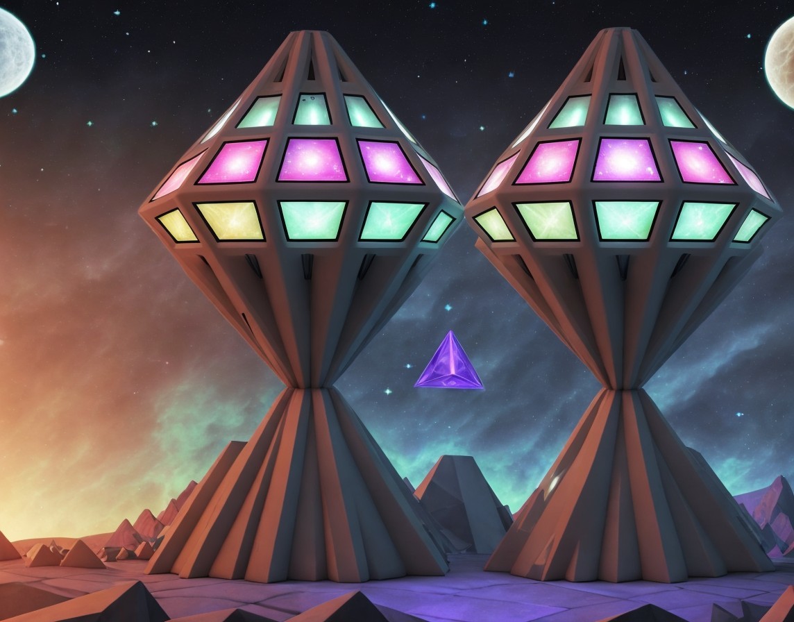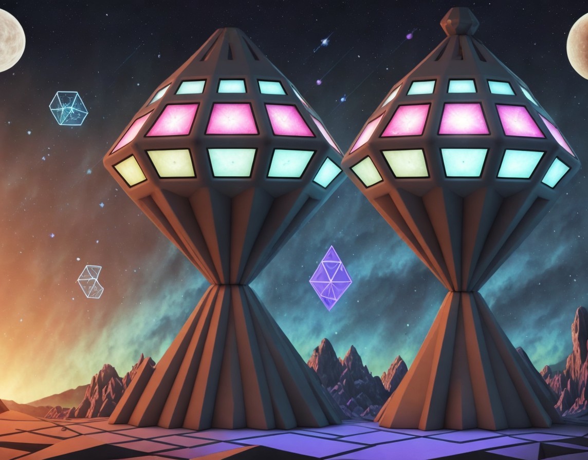 + Prompt:High-tech drug laboratory assimilated with arcane sacred geometric patterns and advanced alien technology. glowing runes and alien glyphs. geometric patterns, hexagonal patterns. Beakers, flasks and other glassware for chemistry. The sun, moon, and planets amongst billowing clouds of nebula in the sky. Ultra Realistic landscape under a complex cosmic sky. Enigmatic astral projection/alien contact, galactic LSD art, surreal psychedelic vibes, sci-fi LSD art. In the style of Cameron Gray