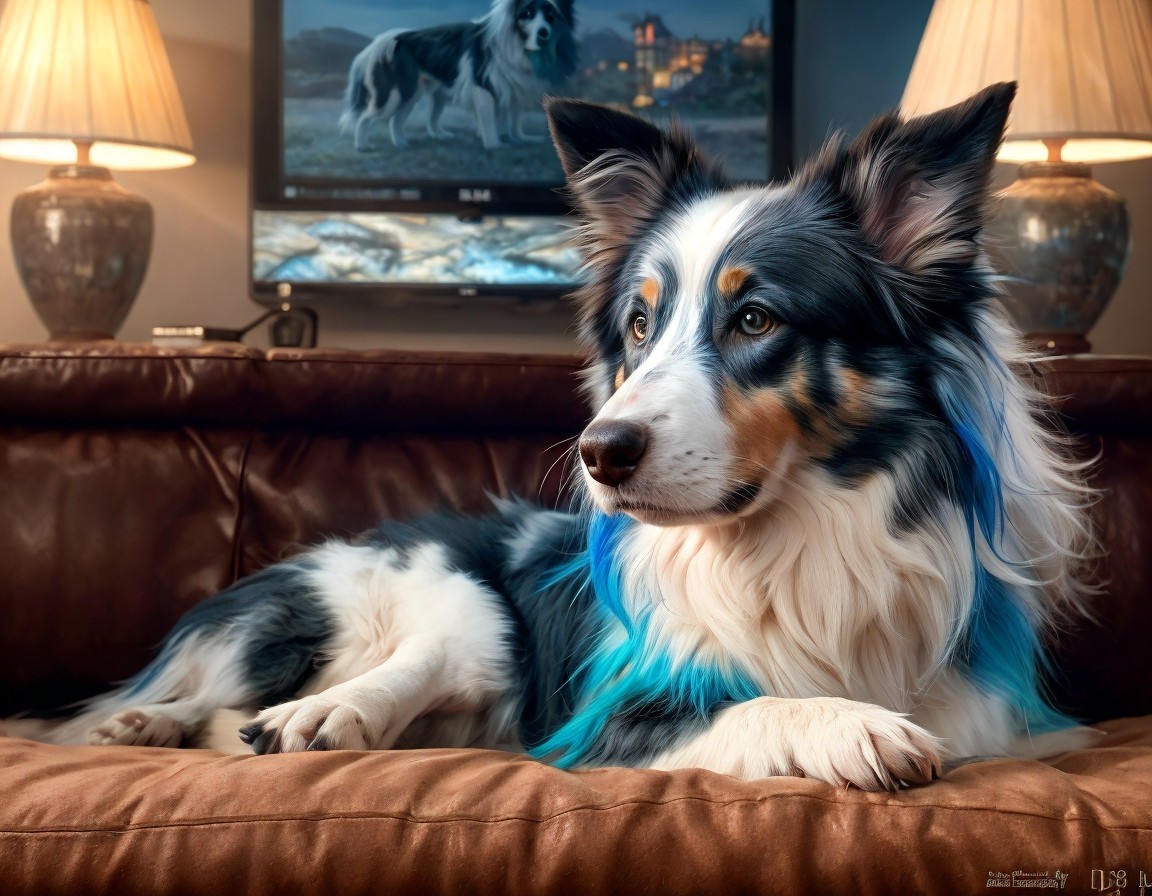 A tricolor Border Collie with a blue blanket on a leather couch, looking aside, with lamps and a TV in the background.