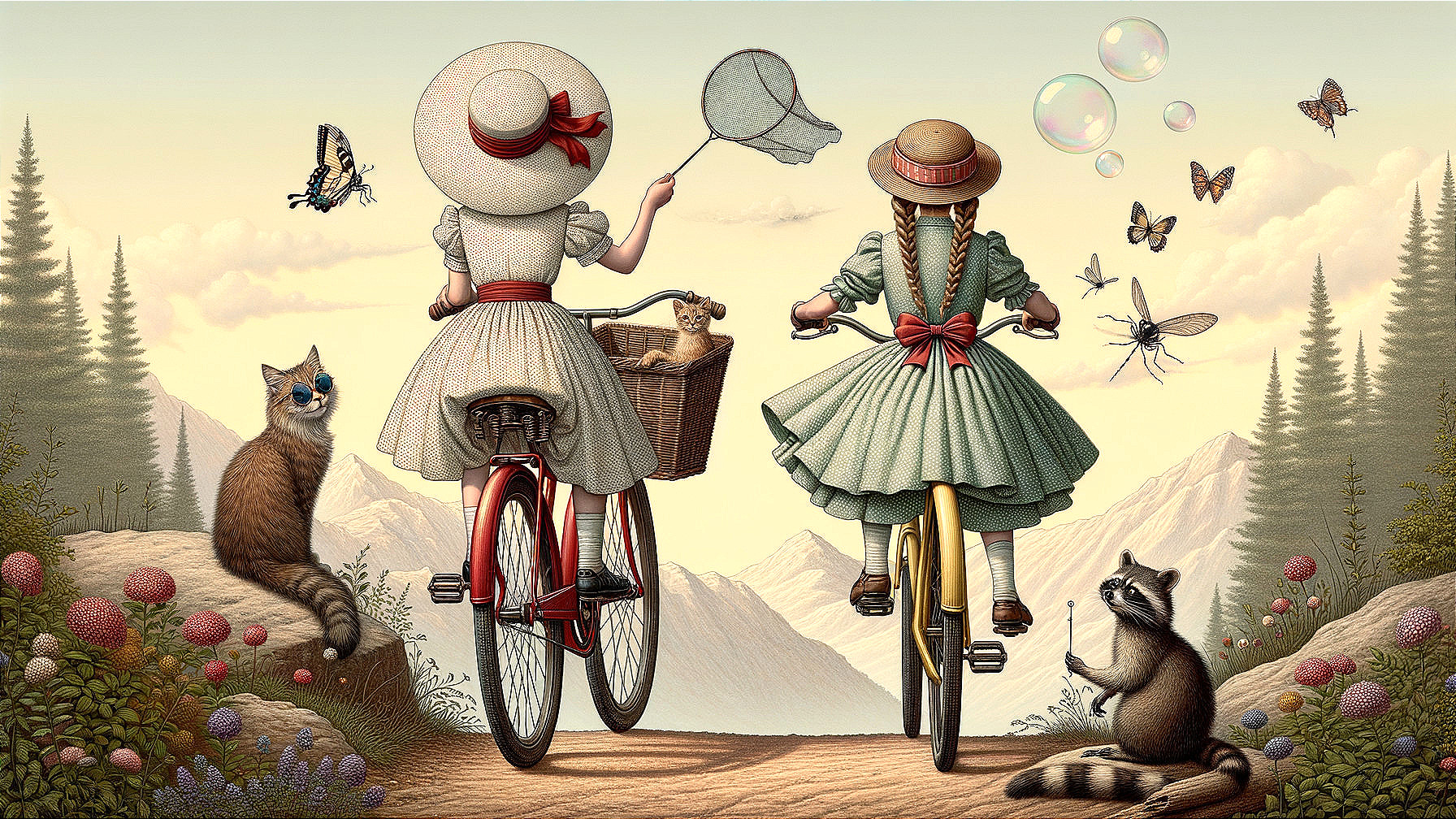 Two girls on vintage bicycles ride through a scenic landscape, with butterflies and bubbles around them. A cat and a raccoon watch curiously, adding a whimsical touch to the serene scene.